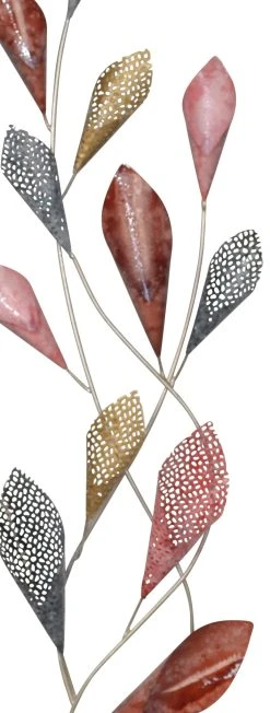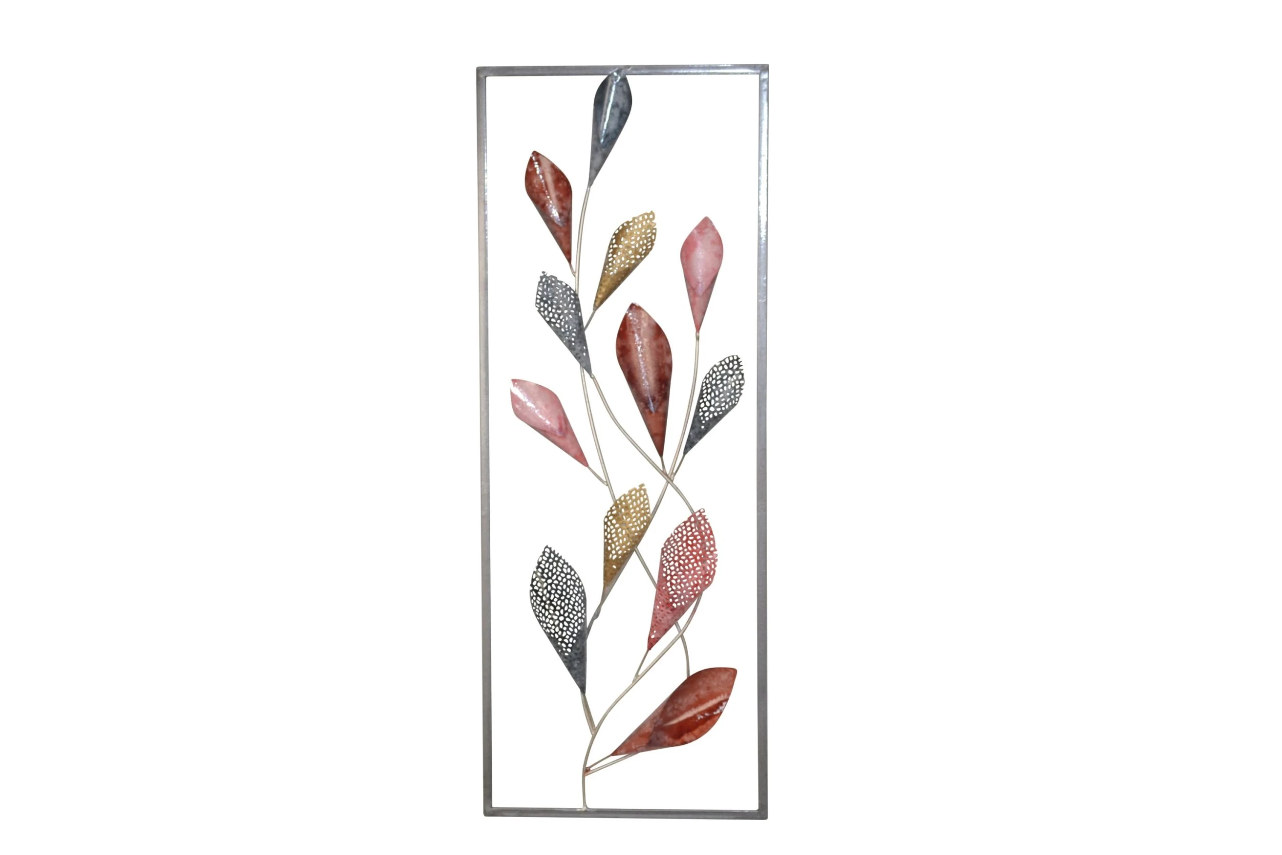 Wanddekoration aus Metall mit einem silberfarbenen Rahmen. In der Mitte sind viele gerollte Blätter eingearbeitet die farblich rot/grau/goldfarben lackiert sind und zusätzlich mit unterschiedlichen Oberflächen gearbeitet sind. Zur Wandmontage. Maße ca. cm: (B/H/T) 29/74/4,4.