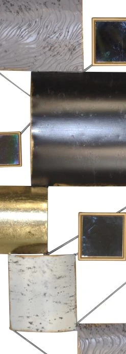 Wanddekoration aus Metall mit vielen unterschiedlich großen quadratischen Metallplatten kombiniert, die in sich leicht gewölbt sind und farblich von grau über cremweiß bis schwarz und teils goldfarben lackiert bzw. beschichtet sind. Zusätzlich mit kleinen Spiegeleinlagen kombiniert. Diese schöne Wanddekoration ist wahlweise quer oder hochkant montierbar. Maße ca. cm: (B/H/T) 91/49/5,5.