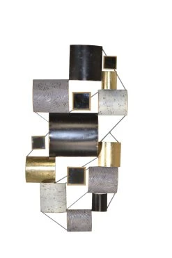 Wanddekoration aus Metall mit vielen unterschiedlich großen quadratischen Metallplatten kombiniert, die in sich leicht gewölbt sind und farblich von grau über cremweiß bis schwarz und teils goldfarben lackiert bzw. beschichtet sind. Zusätzlich mit kleinen Spiegeleinlagen kombiniert. Diese schöne Wanddekoration ist wahlweise quer oder hochkant montierbar. Maße ca. cm: (B/H/T) 91/49/5,5.