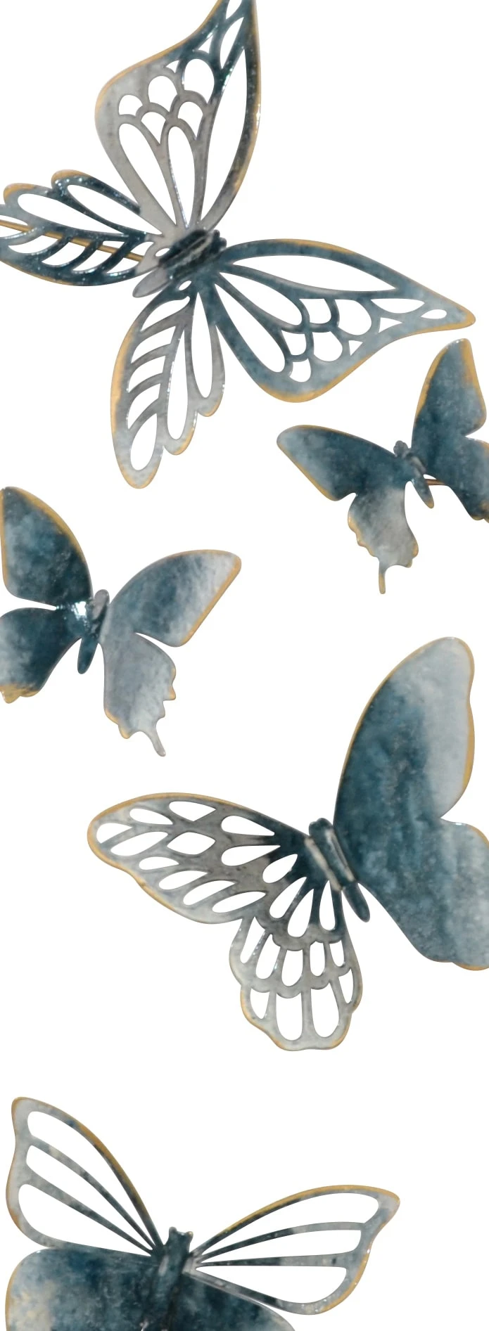 Wunderschöne Wanddekoration aus Metall mit einem goldfarbenen Rahmen, in dem viele Schmetterlinge in unterschiedlichen Größen, Formen eingearbeitet sind und grau lackiert sind. Zur Wandmontage. Maße ca. cm: (B/H/T) 28,5/74,5/4. Diese schöne Wanddekoration lässt sich einfach und gut im gesamten Wohnbereich kombinieren und ist ein toller Blickfang.