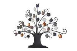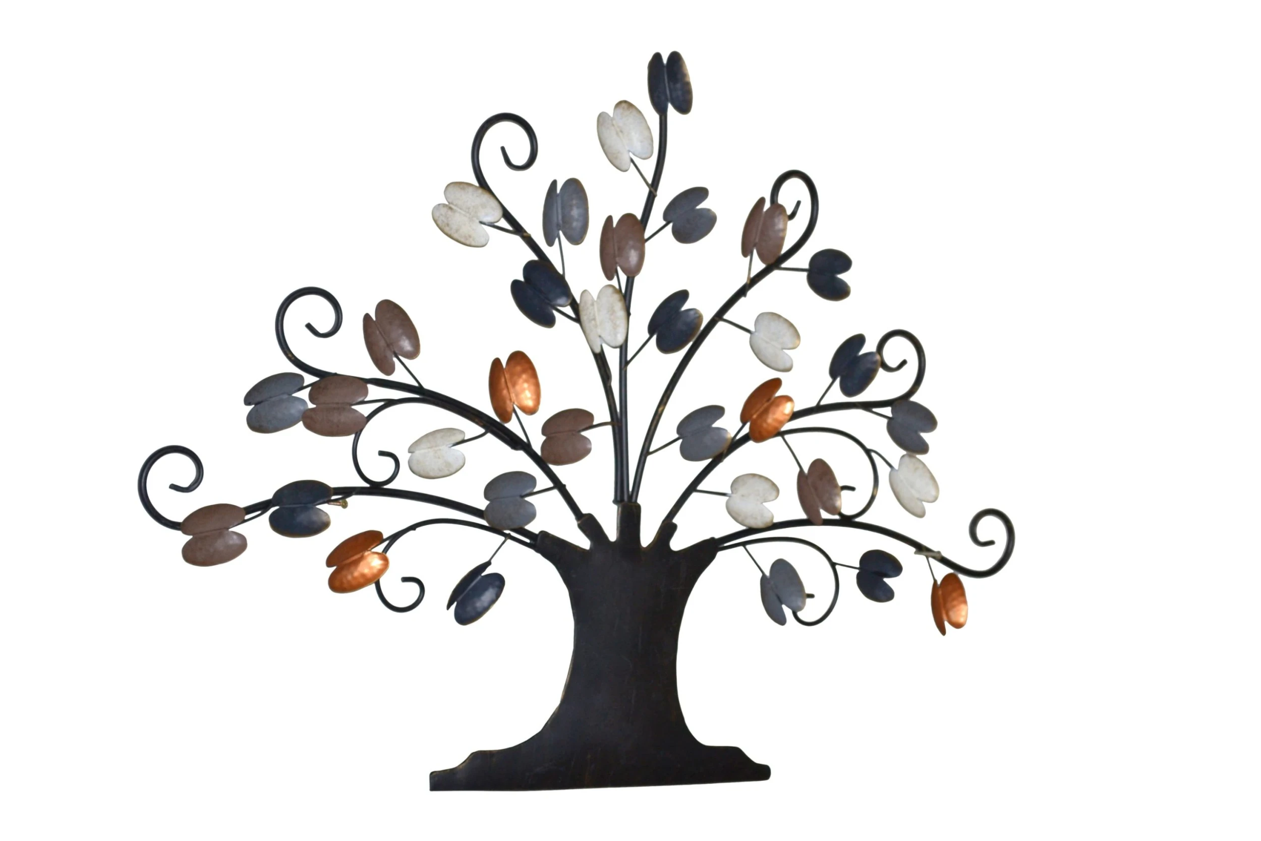 Schöne Wanddekoration “Baum” aus Metall, antik schwarz, lackiert. Blätter schwarz/grau/kupfer/cremeweiß, lackiert und teils goldfarben, gewischt. Zur Wandmontage. Maße ca. cm: (B/H/T) 76/54/3.