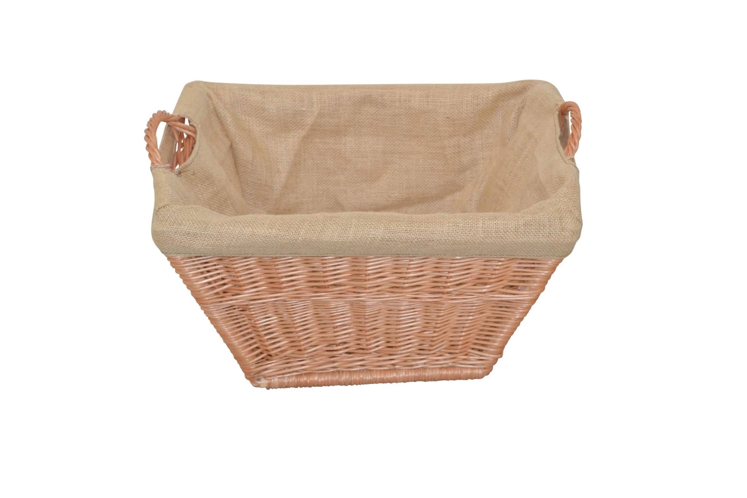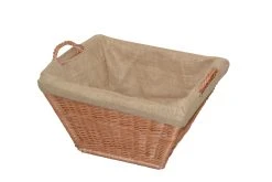 Praktischer Weidenkorb mit Tragegriffen, innen mit einem passenden, losen Jutesack ausgestattet. Individuell nutzbar, ob als Wäschesammler, als Zeitungssammler, als Wäscheaufbewahrungskorb oder als Holzkorb. Lieferung erfolgt montiert. Maße ca. cm: (B/H/T) 50/33/38.