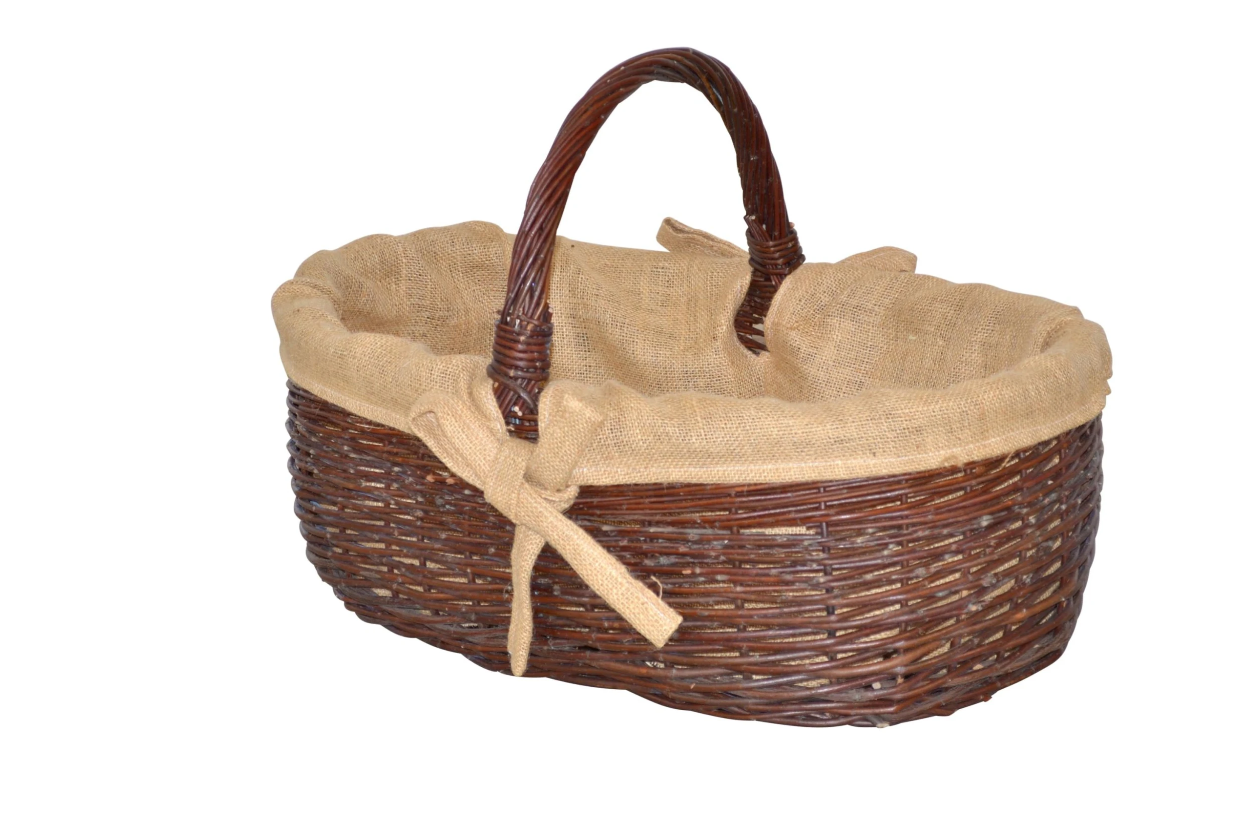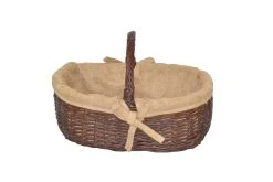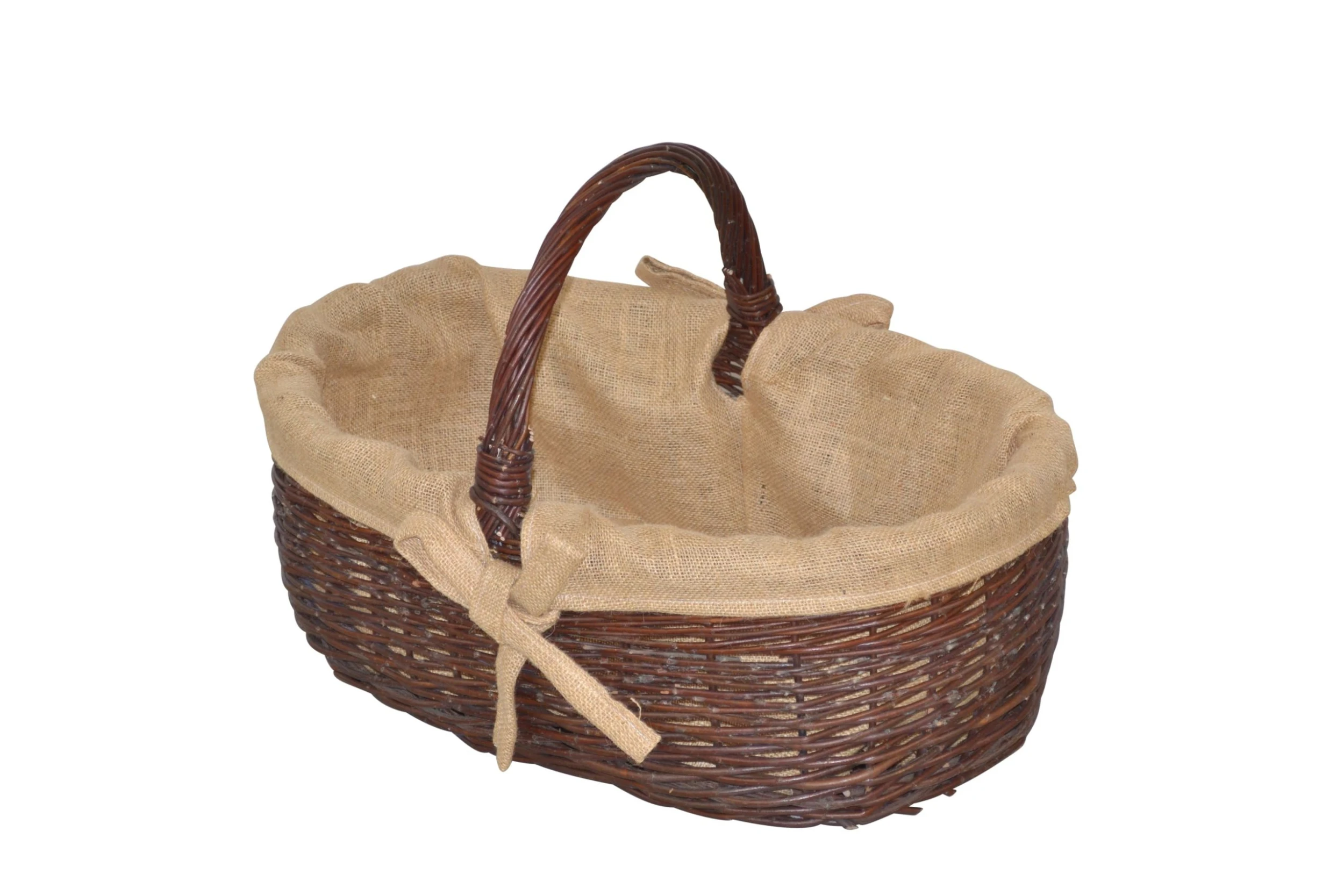 Praktischer Weidenkorb mit Tragegriffen, innen mit einem passenden, herausnehmbaren Jutesack ausgestattet, mit romantischen Befestigungsschleifen. Individuell nutzbar, ob als Wäschesammler, als Zeitungssammler, als Wäscheaufbewahrungskorb oder als Holzkorb. Lieferung erfolgt montiert. Maße ca. cm: (B/H/T) 64/43/43.