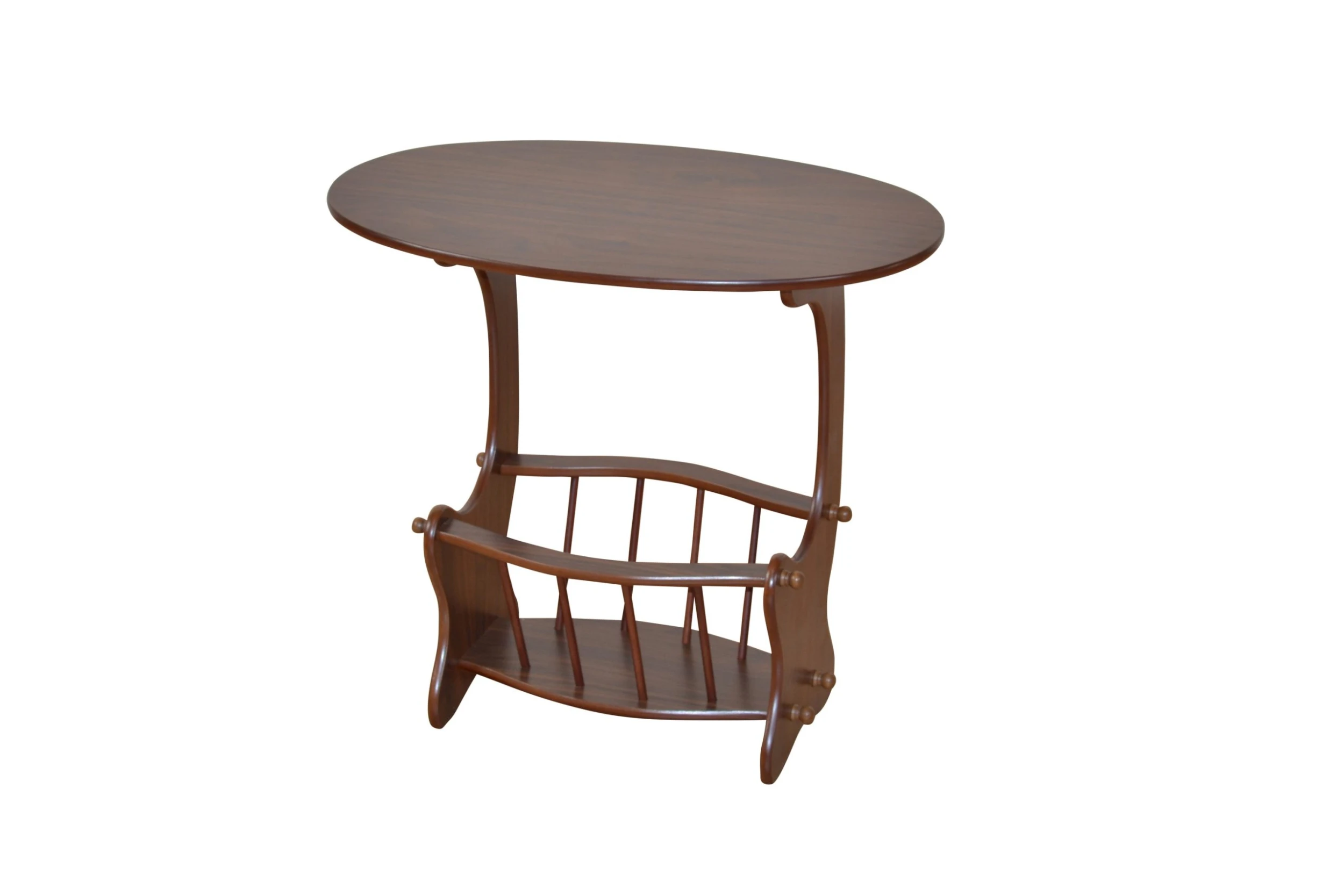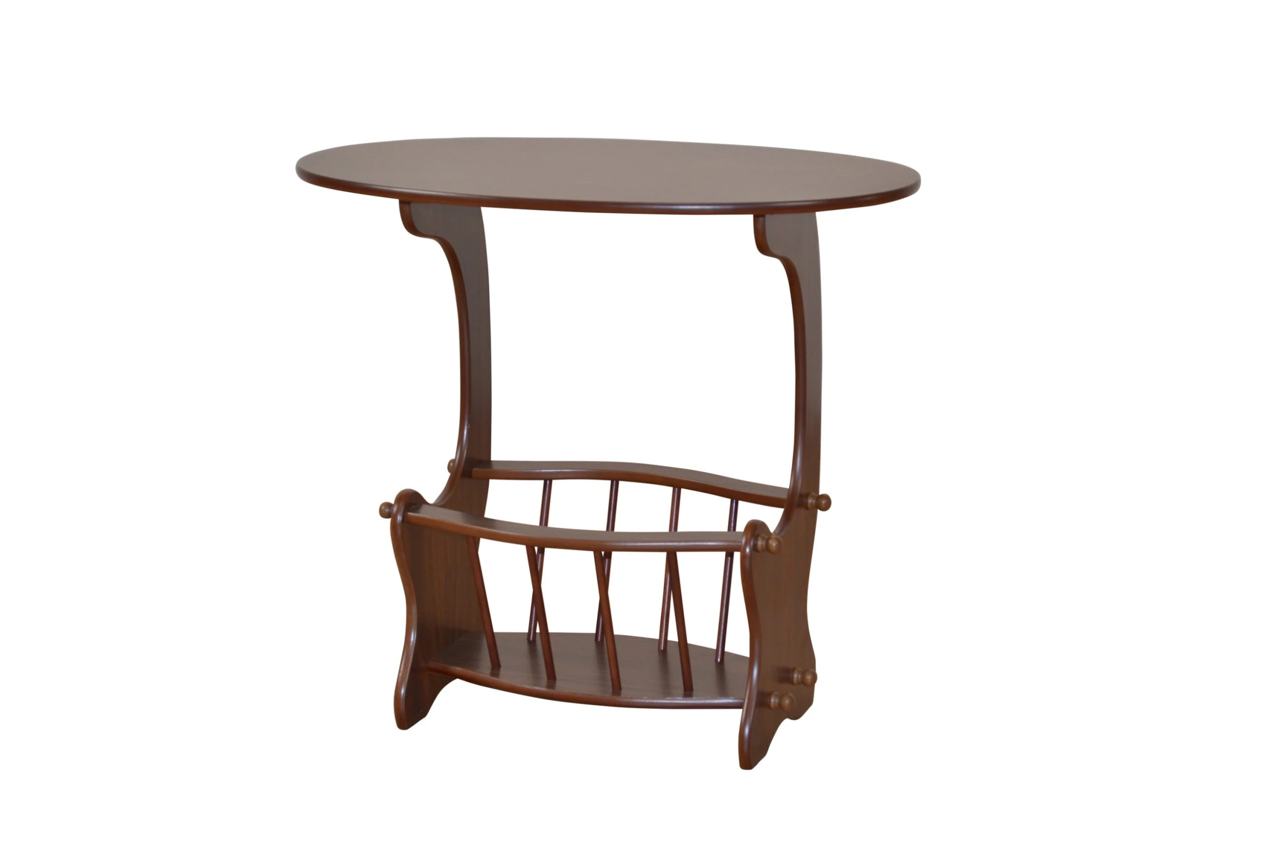 Funktioneller Zeitungstisch teils aus Massivholz, teils aus MDF gefertigt. Oberfläche mit einer pflegeleichten Beschichtung, nussbaumfarben. Oben ovale MDF-Tischplatte, darunter Zeitungsfach, ca. 34 cm breit, ca. 21 cm tief, ca. 16 cm hoch. Lieferung erfolgt zerlegt, mit ausführlicher Aufbauanelitung.