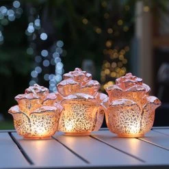 Diese drei schönen LED Dekoleuchten erscheinen in einem prachtvollen Rosenblüten-Look. Die Blüten sind in einer gebrochenen Glas-Optik designt.