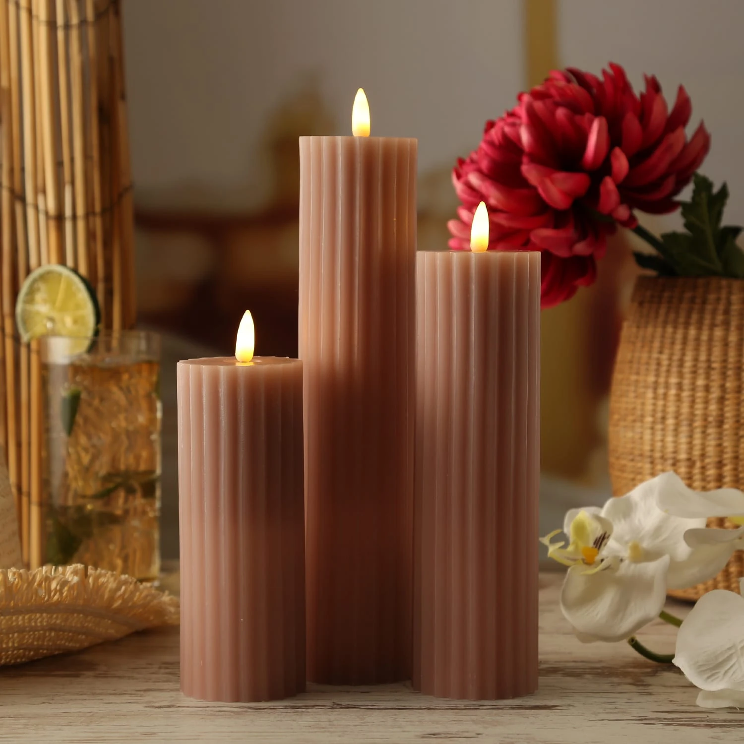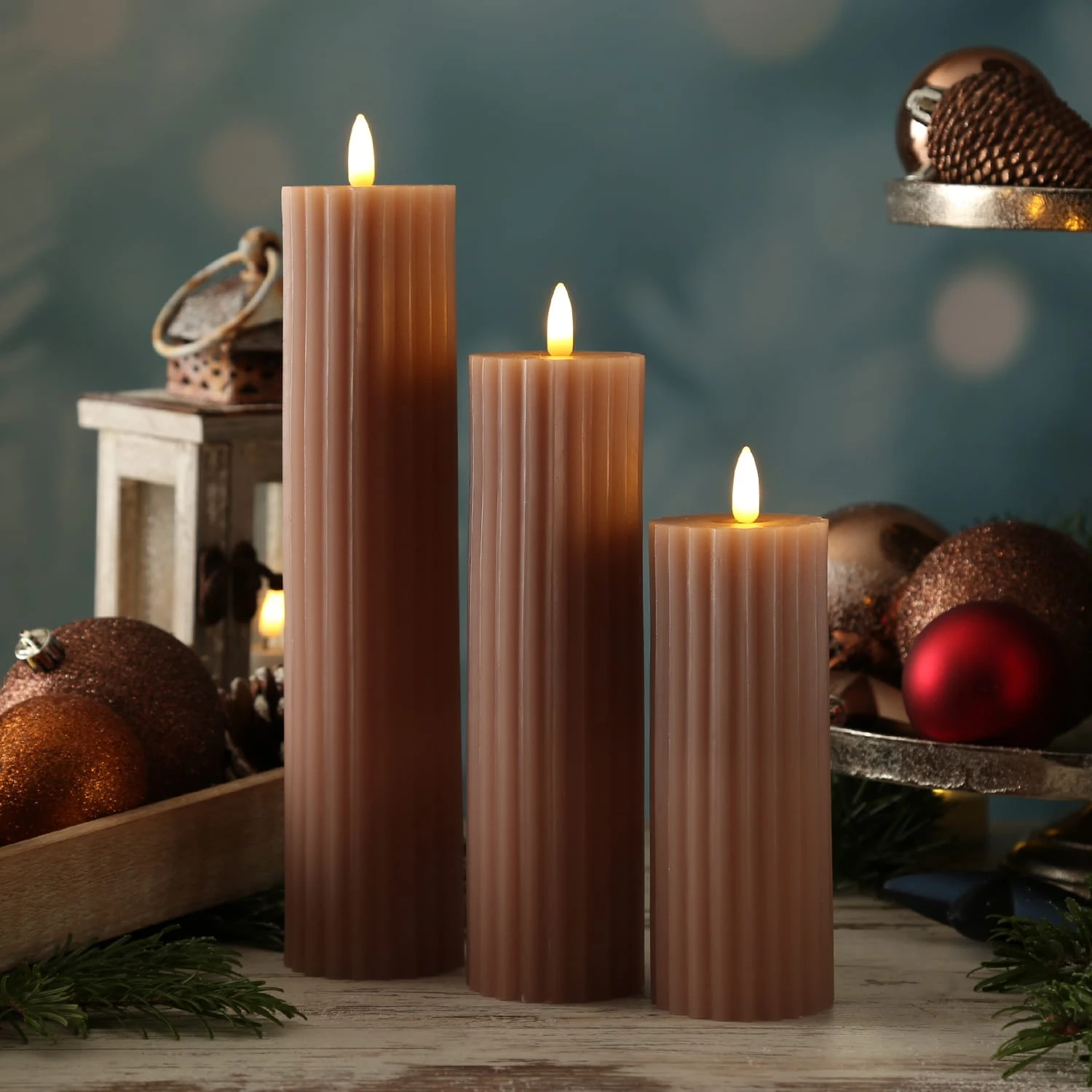 LED Kerzenset LIV – gerillt – Echtwachs – 3D Flamme – 3 Größen – D: 5,5cm – Timer – altrosa – 3er Set Diese dekorative LED Kerzen haben rundherum senkrechte Rillen. Das sieht unglaublich elegant und eben mal anders aus. Die LED Flamme “züngelt” fast wie eine echte Flamme. Schon aus geringer Entfernung sieht sie täuschend echt aus.