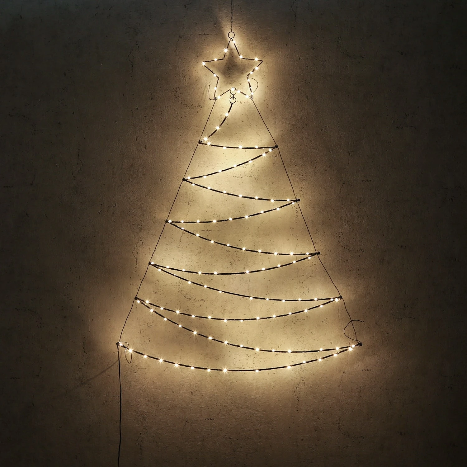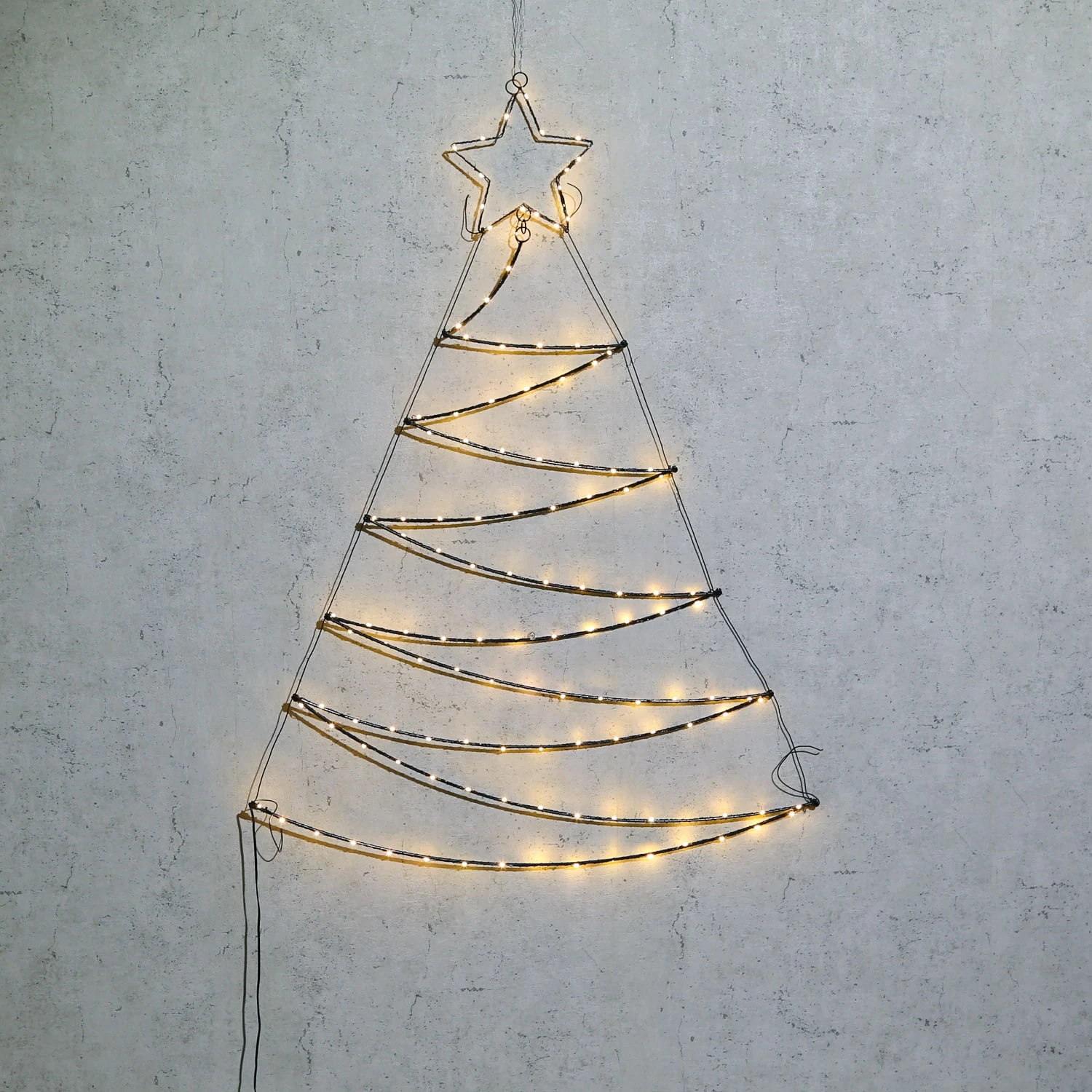 LED Tannenbaum – Wanddeko – zum Aufhängen – 110 bernsteinfarbene LED – H: 1,1m – Außentrafo Der LED Tannenbaum aus Metall ist die perfekte Dekoration zum Aufhängen im Garten, auf dem Balkon, aber auch in deinem Wohnbereich. Super praktisch, wenn Du keinen Platz für einen echten Tannenbaum hast und auch nicht darauf verzichten möchtest! Die bernsteinfarbenen LED verbreiten ein gemütliches Licht.