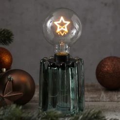 LED Dekolampe – sternförmige Filament LED – Glas – H: 21,5cm – Batteriebetrieb – grün Die wunderschöne LED Dekolampe sieht einfach klasse aus. Die warmweiße Filament LED in Sternform in der Glühbirne sieht einfach klasse aus und verbreitet ein gemütliches Licht.
