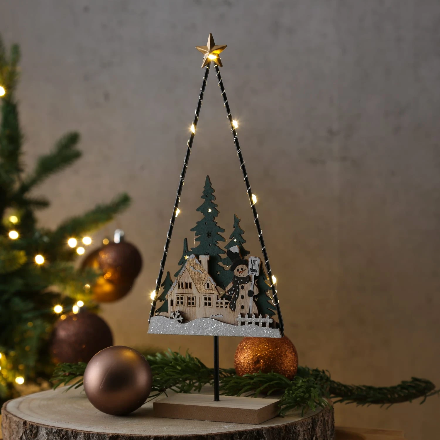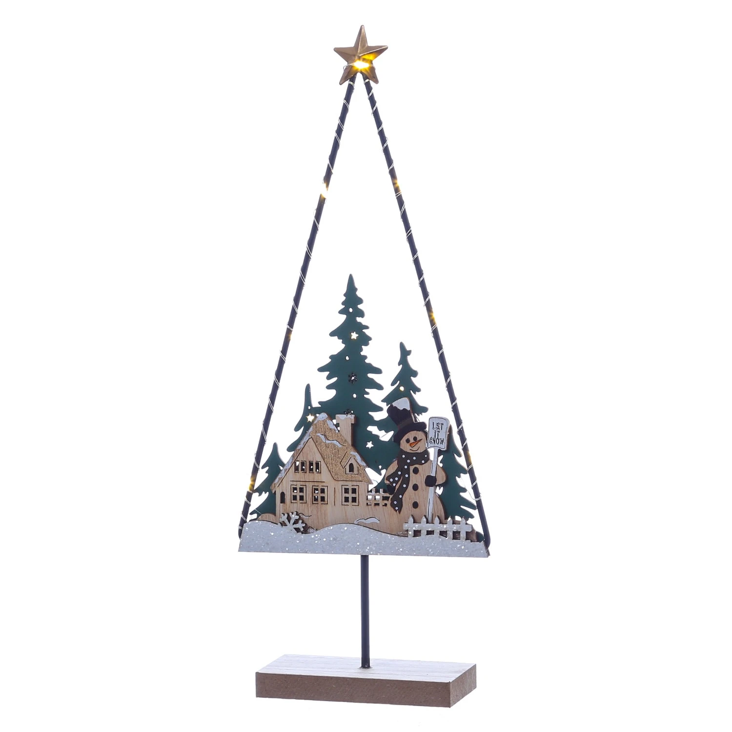 LED Dekoleuchte SCHNEEMANN – Dekoobjekt – Holz – 10 warmweiße LED – H: 33cm – Batteriebetrieb