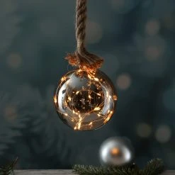 LED Glaskugel JUTTA – mit Juteseil – 30 bernsteinfarbene LED – D: 14cm – Timer – rauchig grau Diese 14cm Glaskugel hängt an einem dicken Juteseil, durch das ein Kabel vom Batteriefach geführt ist. In der Kugel befindet sich eine dünne Drahtlichterkette an der 30 leuchtende LED sitzen. Durch das rauchig-graue Glas leuchten die bernsteinfarbenen Micro LED besonders schön.