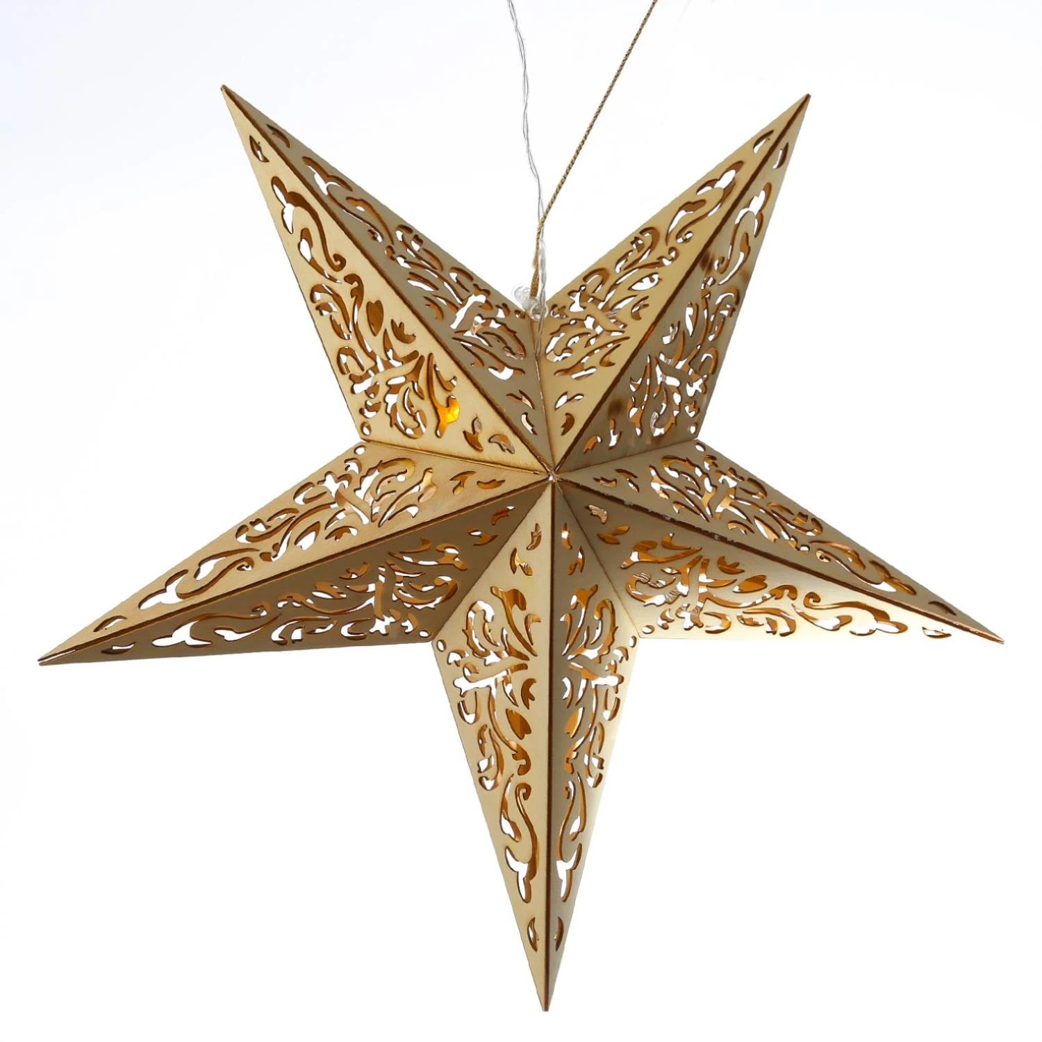 LED Holzstern – hängend – 5-zackig – 10 warmweiße LED – D: 40cm – inkl. Fernbedienung – natur Ein fantastischer, aus Holz gefertigter Weihnachtsstern, der außergewöhnlich schön aus sieht. Durch das filigrane Loch-Muster leuchten die 10 warmweißen LED besonders schön und sorgen für eine tolle Atmosphäre.