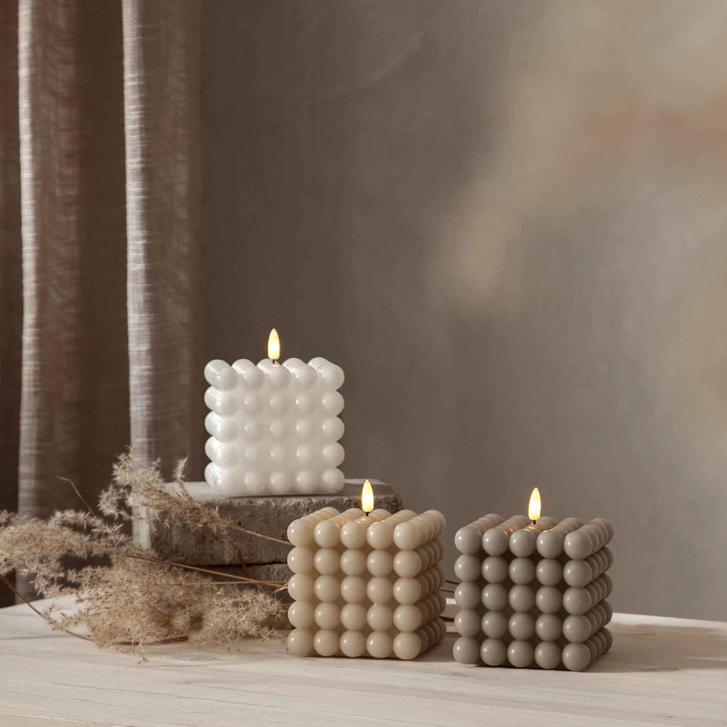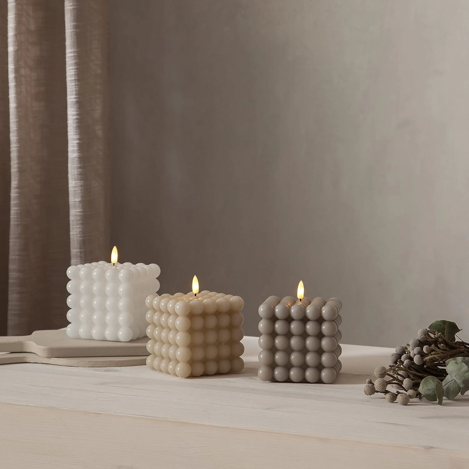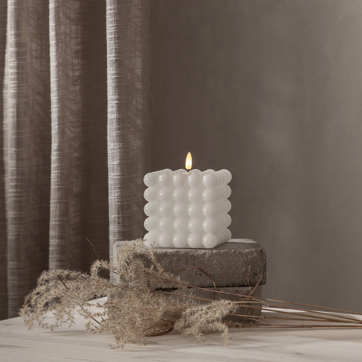 LED Kerze Bubble – Würfelkerze – Echtwachs – realistische 3D Flamme – H: 12,5cm – Timer – weiß Diese LED Würfelkerze ist ein ganz besonders schicker Blickfang und die Form ist sehr außergewöhlich. Der Würfel besteht aus kleinen Wachskugeln, die symmetrisch angeordnet sind. Die simulierte LED Flamme flackert besonders schön und realistisch. Schon aus einem kleinen Abstand ist sie kaum mehr von einer echten Flamme zu unterscheiden.