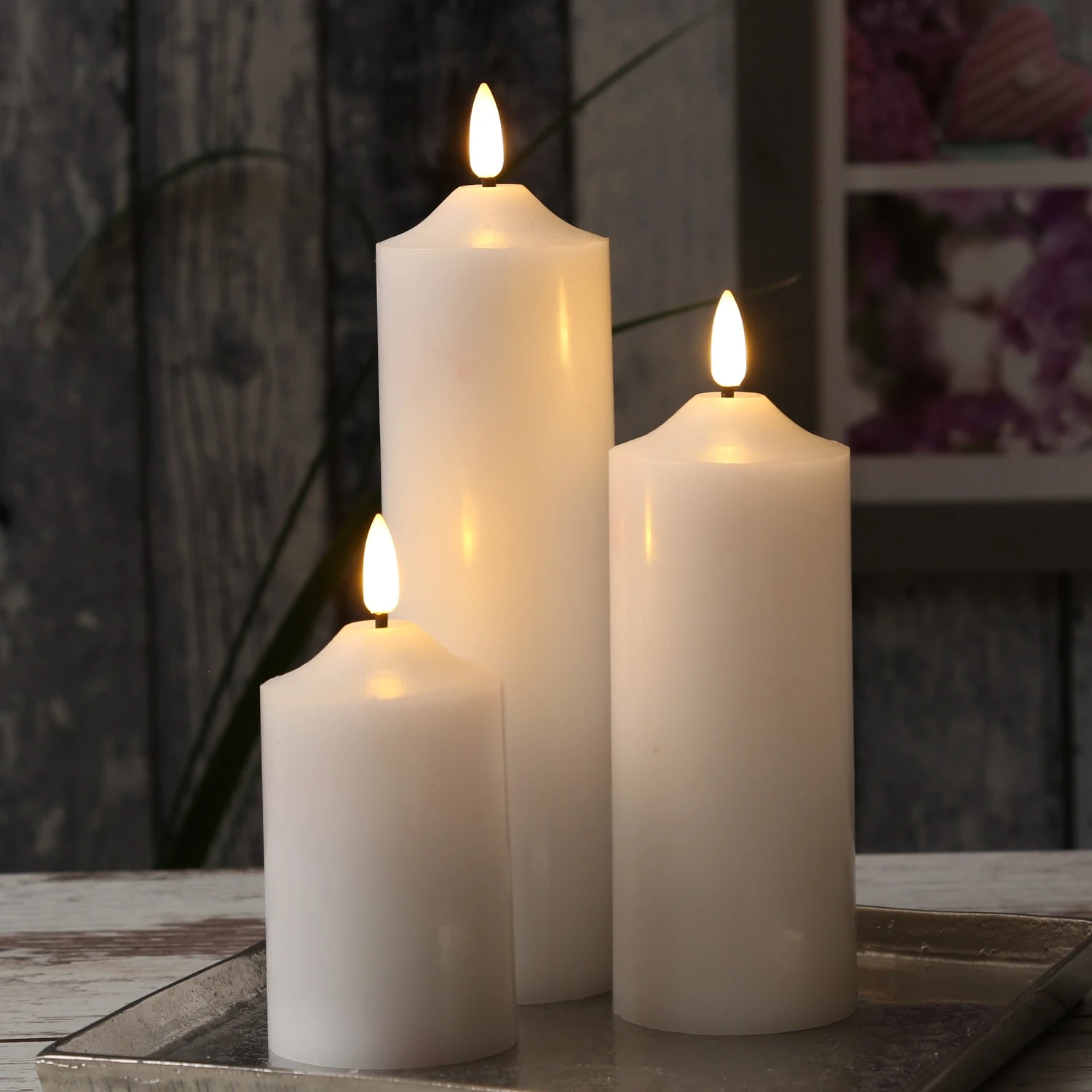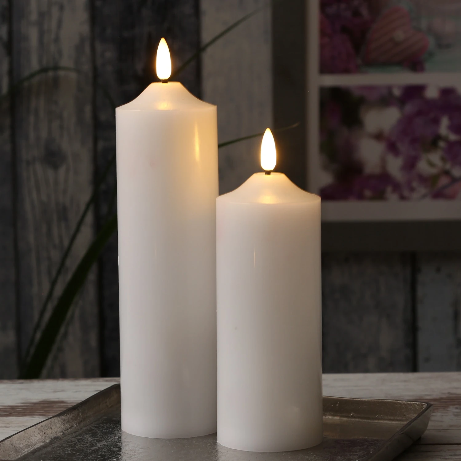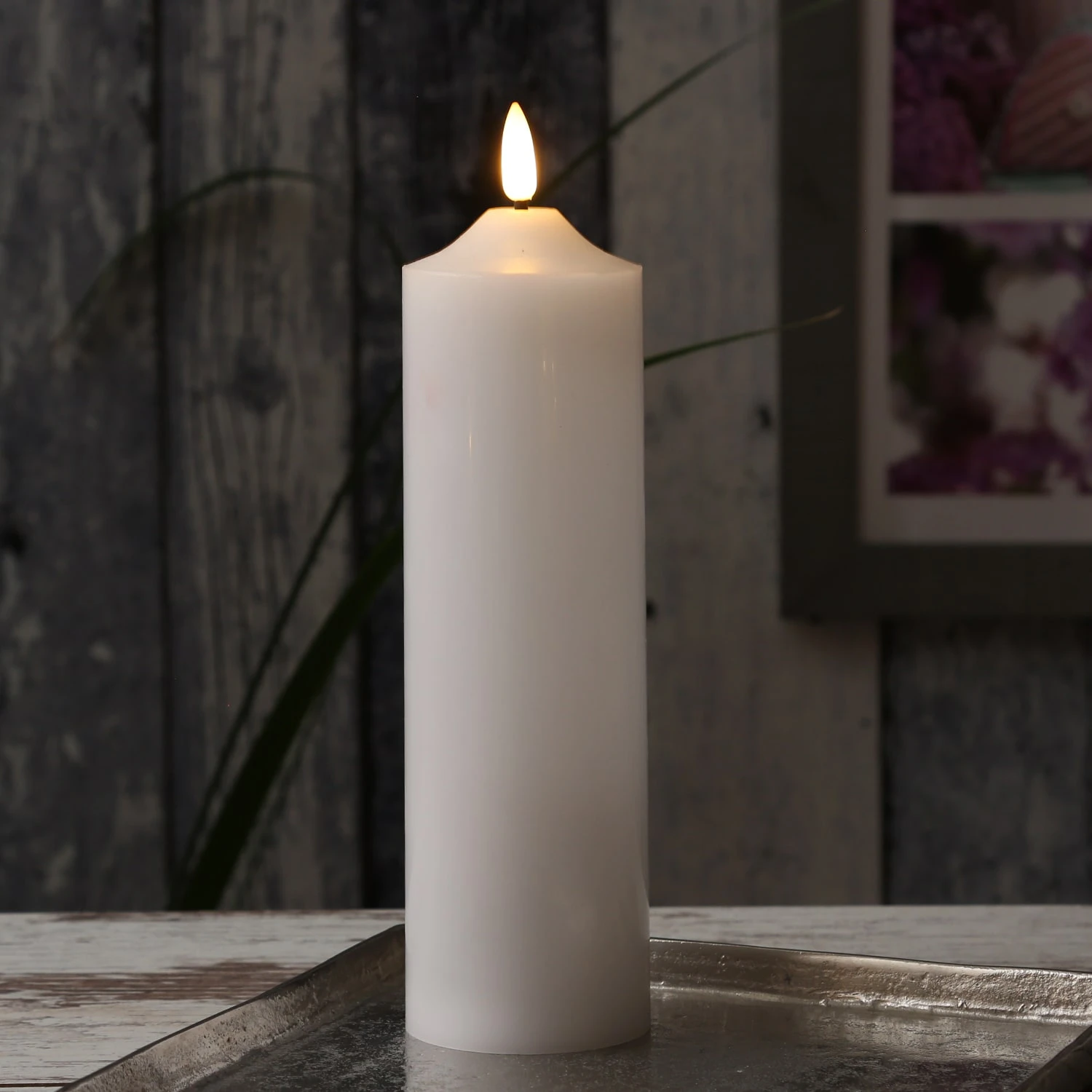 LED Stumpenkerze Flamme – Echtwachs – flackernde 3D Flamme – H: 22,5cm – Batterie – Timer – weiß Diese Stumpenkerze leuchtet in einem realistischen gelblich-orangen Farbton. Die 3D Flamme zeigt ein leichtes Flackern, das eine romantische und gemütliche Atmosphäre erzeugt.