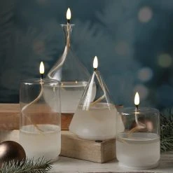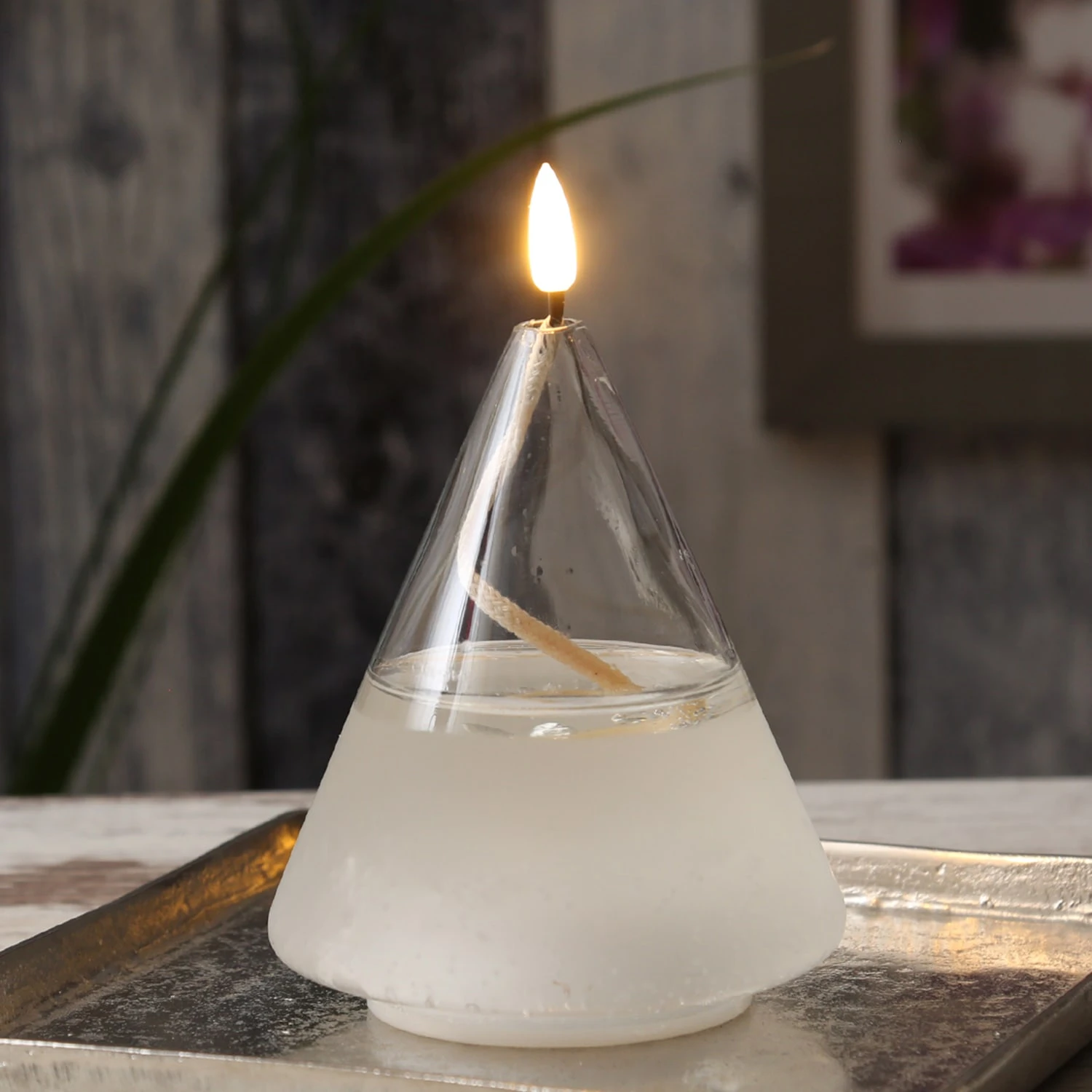 LED Kerze im Glas – Öllampe mit Flüssigwachs Optik – flackernde 3D Flamme – Timer – H: 15,5cm – Kegel Dieses elegante Öllicht sieht wirklich aus wie ein echtes – doch in Wahrheit ist eine hochwertige LED als Flamme verwendet, die in einem ganz herrlichen Licht leicht flackert. Es sieht aus wie eine echte Flamme. Das Glas ist mit einer festen, transparenten Gelmasse gefüllt, die aussieht wie flüssiges Lampenöl.