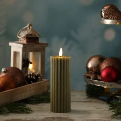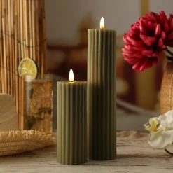 LED Kerze LIV – gerillt – Echtwachs – warmweiße 3D Flamme – H: 17,5cm – D: 5,5cm – Timer – grün Diese dekorative LED Kerze hat rundherum senkrechte Rillen. Das sieht unglaublich elegant und eben mal anders aus. Die LED Flamme “züngelt” fast wie eine echte Flamme. Schon aus geringer Entfernung sieht sie täuschend echt aus.