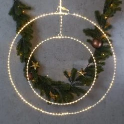 LED Kreis – Metallring – hängend – 165 warmweiße LED – D: 58cm – Außentrafo – weiß Dieser hängende 58cm LED Metallring ist die perfekte Dekoration für Deinen Garten, auf dem Balkon oder auf der Terrasse. Aber auch in Deinem Wohnbereich an Deinen Fenstern oder an der Wand sorgt dieser LED Kreis für eine gemütliche Stimmung.