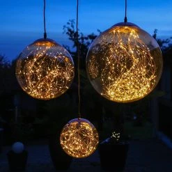LED Kugel mit Drahtlichterkette – hängend – 80 bernsteinfarbene LED – D: 20cm – f. Außen – rauchgrau Die hängende LED Kugellampe ist die perfekte Dekoration für Deinen Garten, auf dem Balkon oder auf der Terrasse. Aber auch in Deinem Wohnbereich an der Wand oder einem Schrank macht diese Kugellampe richtig was her. Die Rauchglasoptik der Dekokugel mit der bernsteinfarbenen LED Drahtlichterkette sieht einfach klasse aus.