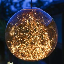 LED Kugel mit Drahtlichterkette – hängend – 300 bernsteinfarbene LED – D: 40cm – f.Außen – rauchgrau Die hängende LED Kugellampe ist die perfekte Dekoration für Deinen Garten, auf dem Balkon oder auf der Terrasse. Aber auch in Deinem Wohnbereich an der Wand oder einem Schrank macht diese Kugellampe richtig was her. Die Rauchglasoptik der Dekokugel mit der bernsteinfarbenen LED Drahtlichterkette sieht einfach klasse aus.