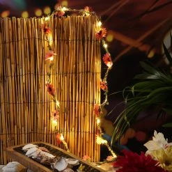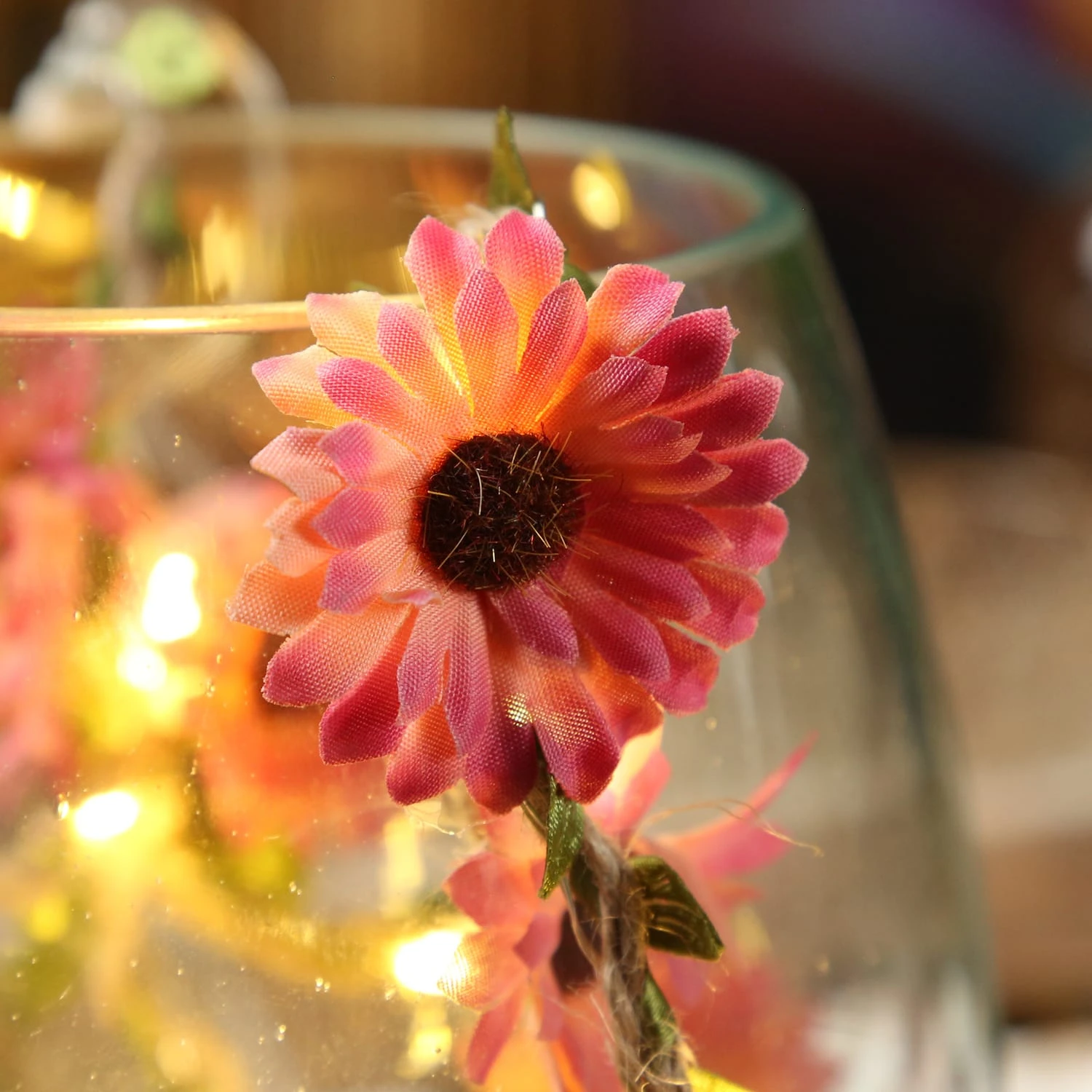 Die LED Lichterkette ist mit einem natürlichen Seil und einer Blumenranke mit 15 Blumen aus Stoff umwickelt. Die warmweißen Tautropfen LED leuchten wunderschön und die Lichterkette ist ein absoluter Hingucker.