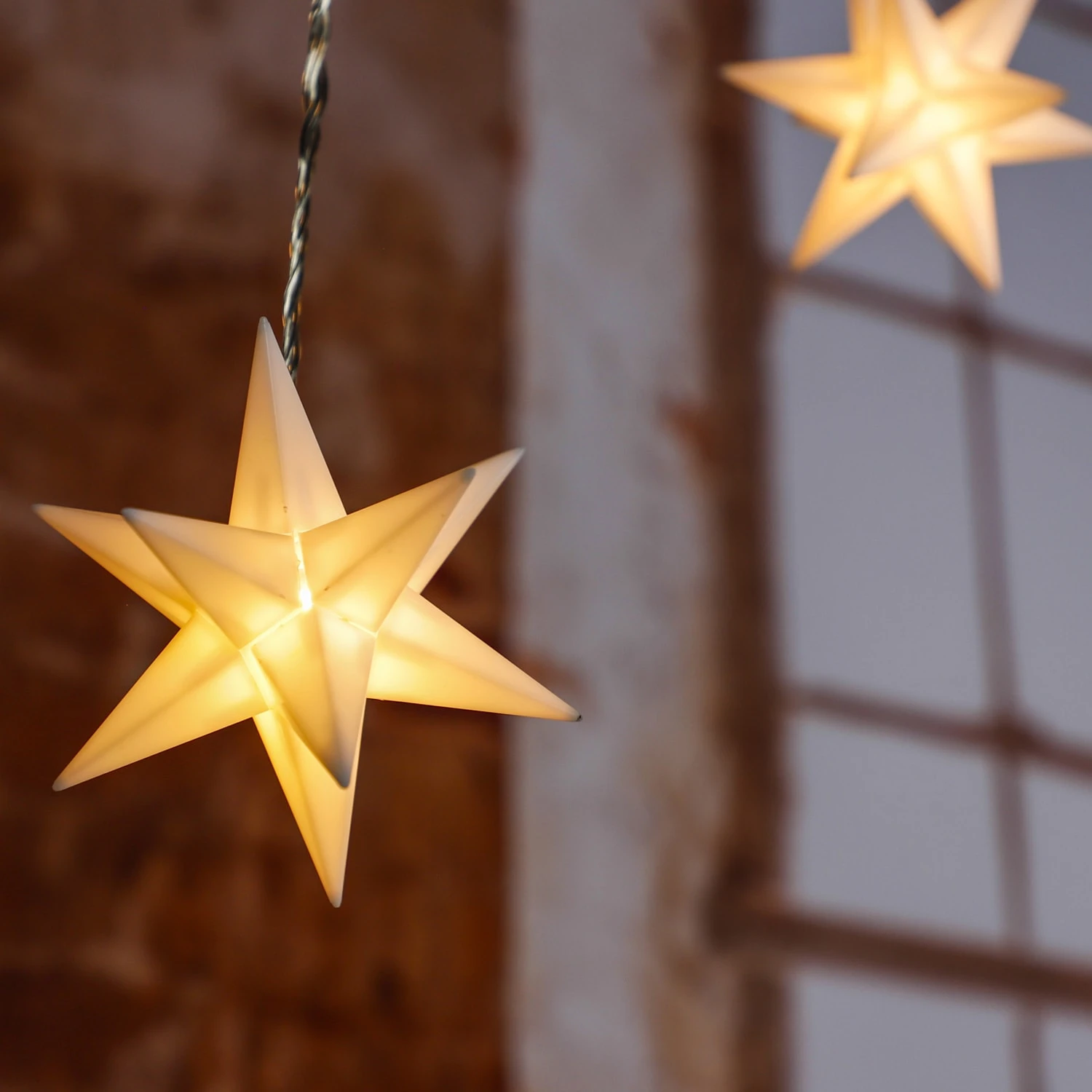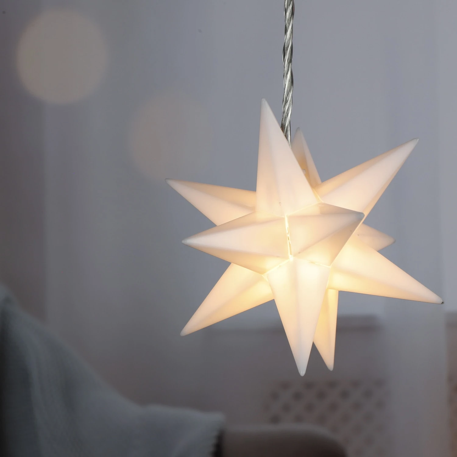 LED Lichtervorhang 3D Sterne – 9 weiße Sterne – warmweiße LED – L: 160cm, H: 120cm – Batterie Diese Art von Lichterketten liegt total im Trend. Die angehängten Sterne sind dreidimensional und so von allen Seiten her sehr schön.