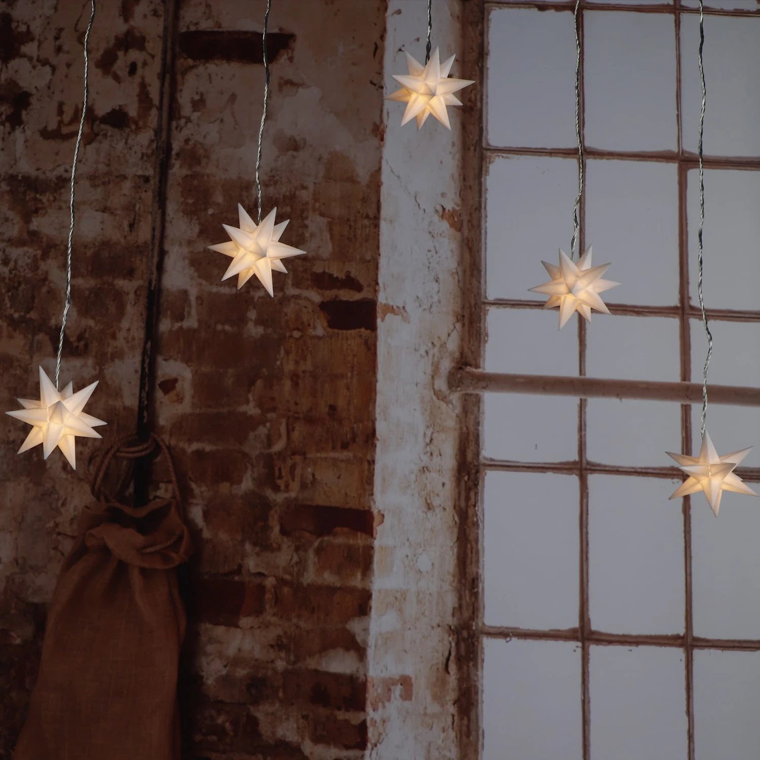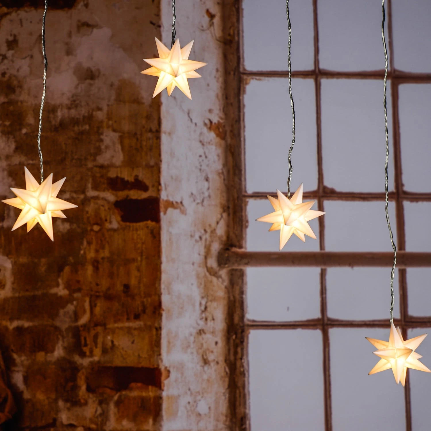 Im Innern befindet sich jeweils eine warmweiß leuchtende LED. Jeder Stern hängt an einem Kabel wobei die Sterne durch die unterschiedliche Kabellänge ein Dreieck bilden.