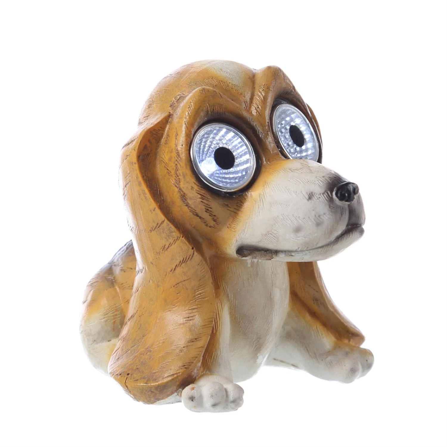 LED Solar Hund SAM – Gartenfigur – 2 kaltweiße LED – Dämmerungssensor – H: 11cm – braun, weiß Ist dieser Hund nicht knuffig! Die LED Solar Gartenfigur mit den leuchtenden Augen bewacht nachts Deinen Garten oder leuchtet den Einbrechern den Weg. Dabei sieht der Basset doch so richtig putzig und ulkig aus.