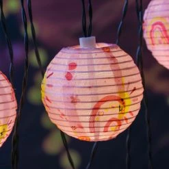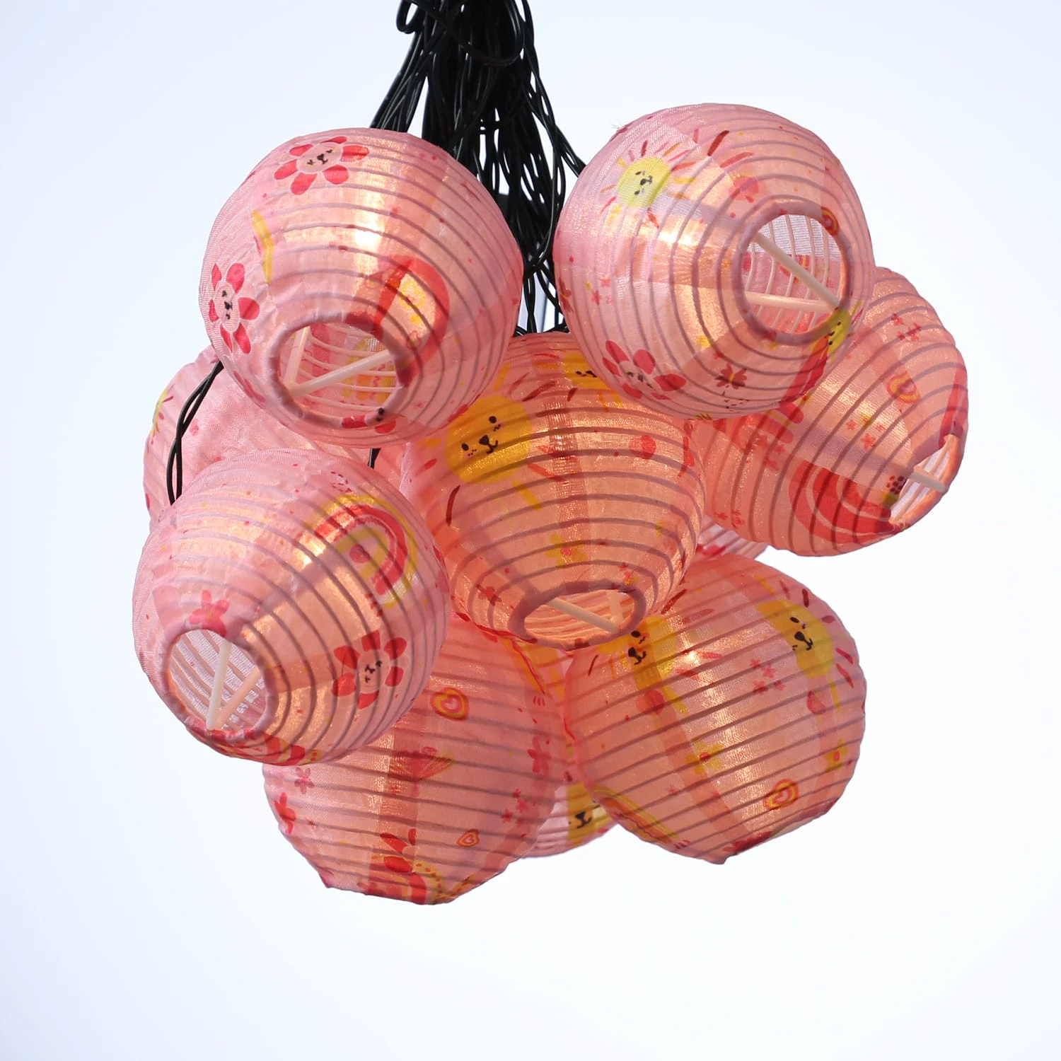 10 beleuchtete Lampions an Lichterkette mit Sonne und Blümchen als Motiv