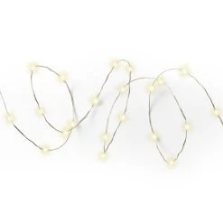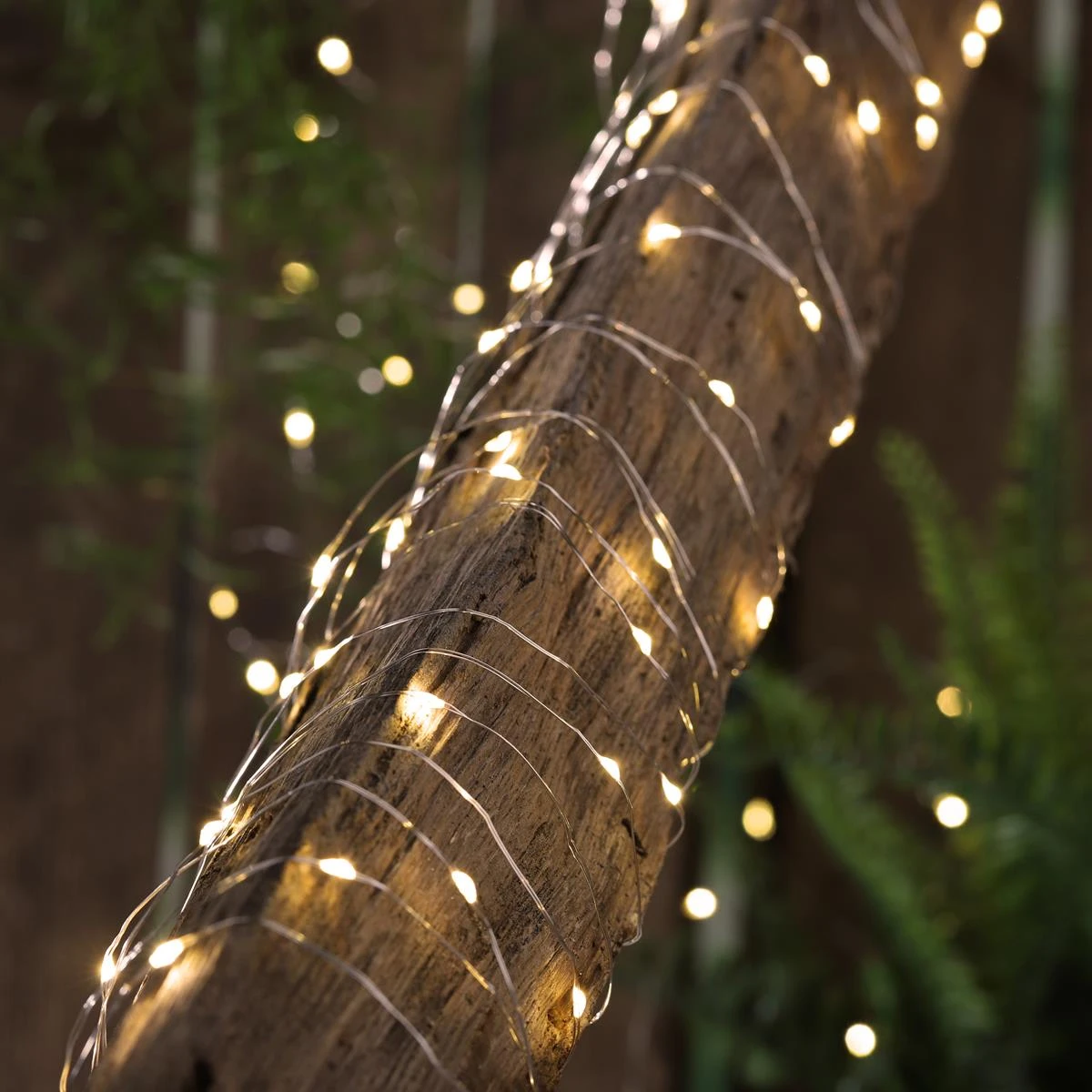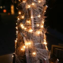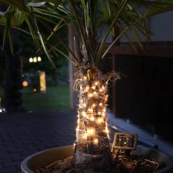 Die Kette selbst besteht aus einen wetterfest imprägnierten Silberdraht, der mit 50 warmweißen LED besetzt ist. Die Länge des Drahtes ist mit 4,9m perfekt, um auch einen Busch oder einen Blumentopf zu dekorieren. Auch um den Stamm eines Baumes gewickelt bekommst Du einen tollen Dekoeffekt.