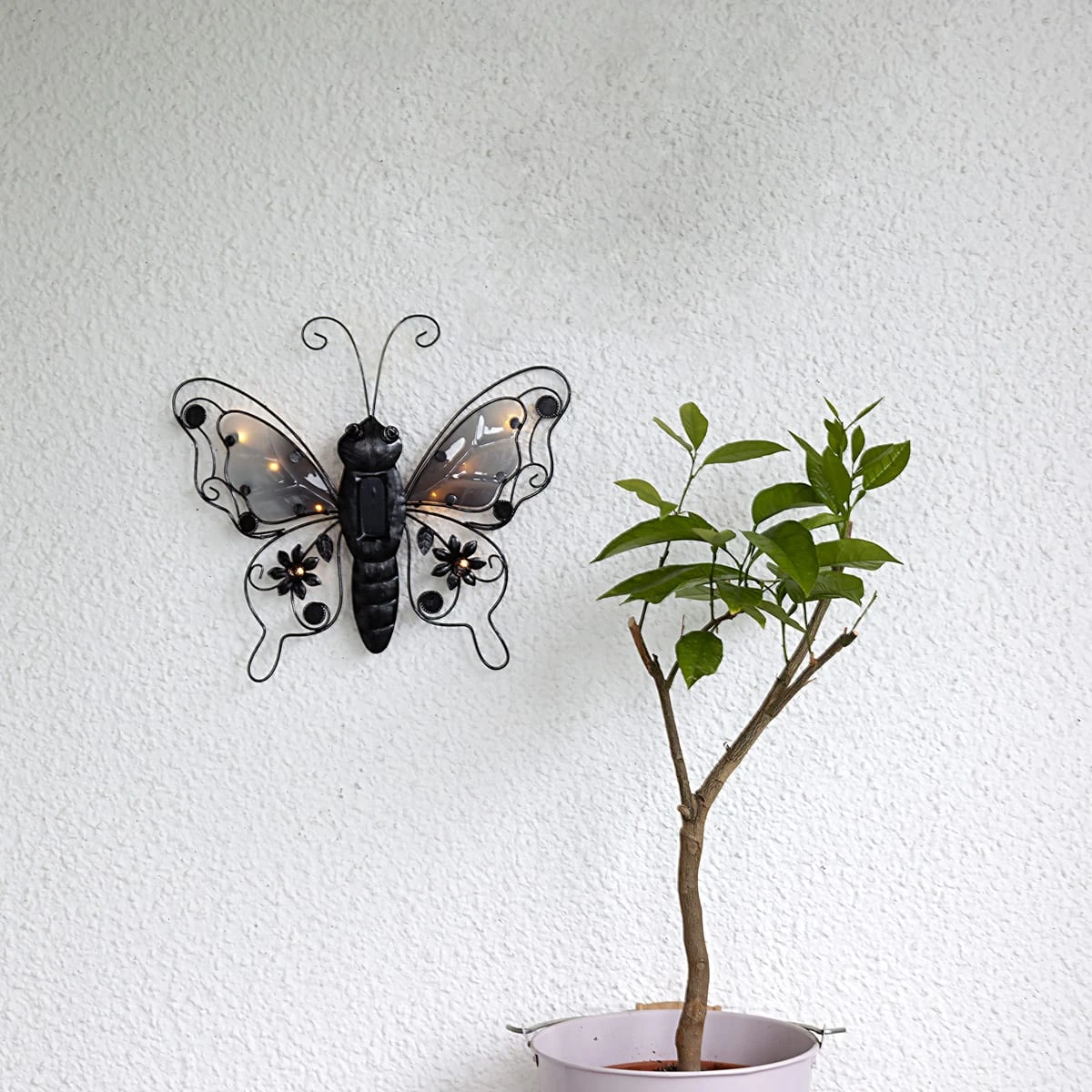 LED Solar Wanddeko SCHMETTERLING – 8 warmweiße LED – H: 34cm – Dämmerungssensor – schwarz