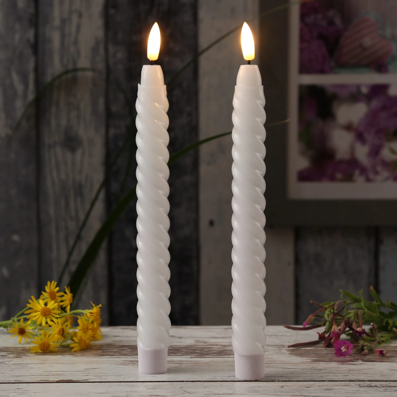 LED Stabkerzen TWIST – Echtwachs – flackernde 3D Flamme – H: 25cm – Timer – weiß – 2er Set Jetzt kommt endlich Schwung in die Bude, bzw die Kerzen. Die neuen LED Stabkerzen TWIST haben einen gedrehten Stumpen. Das sieht unglaublich elegant und eben mal anders aus. Die LED Flamme “züngelt” fast wie eine echte Flamme. Schon aus geringer Entfernung sieht sie täuschend echt aus.