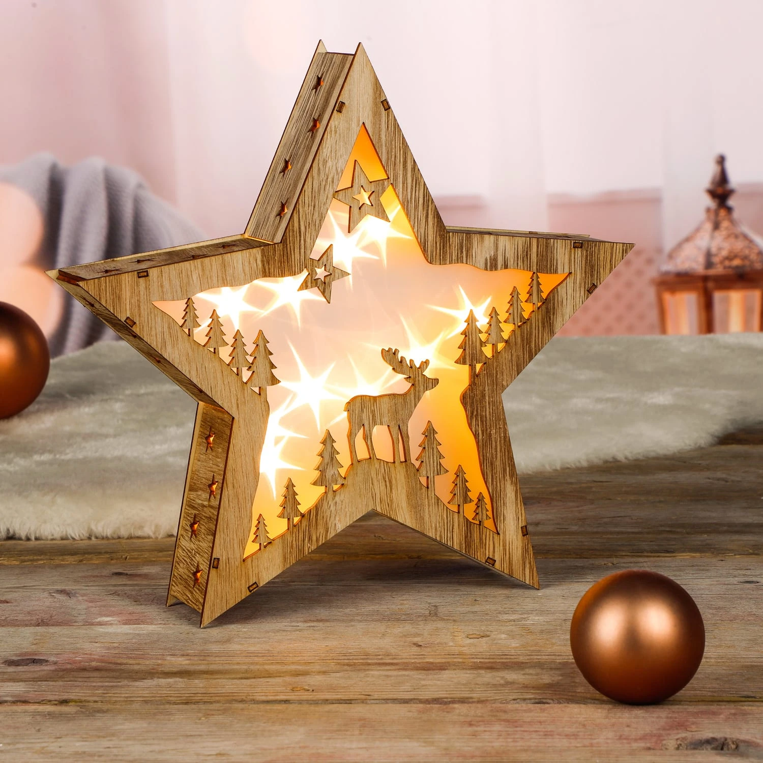 LED Stern mit Hirsch Motiv – stehend – Holz – 10 warmweiße LED – H: 28,5cm – Batterie – Innen Diese weihnachtliche Dekoleuchte zeigt einen Hirsch in winterlichen Wald als Schattenbild. Im Innern des Sterns aus Holz leuchten 10 warmweiße LED durch die halbtransparente Scheibe und erzeugen tolle Lichtreflexe.