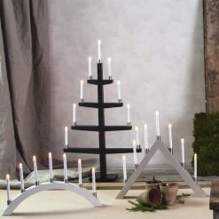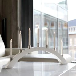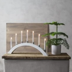 Der 67cm breite und 40cm hohe Lichterbogen ist mit 7 Kerzen mit warmweißen Lämpchen bestückt. Er eignet sich perfekt für die Dekoration am Fensterbrett oder auf einer Kommode.