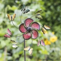Windrad Schmetterling – Gartendeko – Metall – Erdspieß – H: 152cm – rot, gelb, blau Das Windrad aus Metall mit der roten Blumen in der Mitte und den kleinen buten Schmetterlingen drum herum ist eine ganz besondere Dekoration für Deinen Garten, Deine Terrasse oder auf Deinem Balkon.