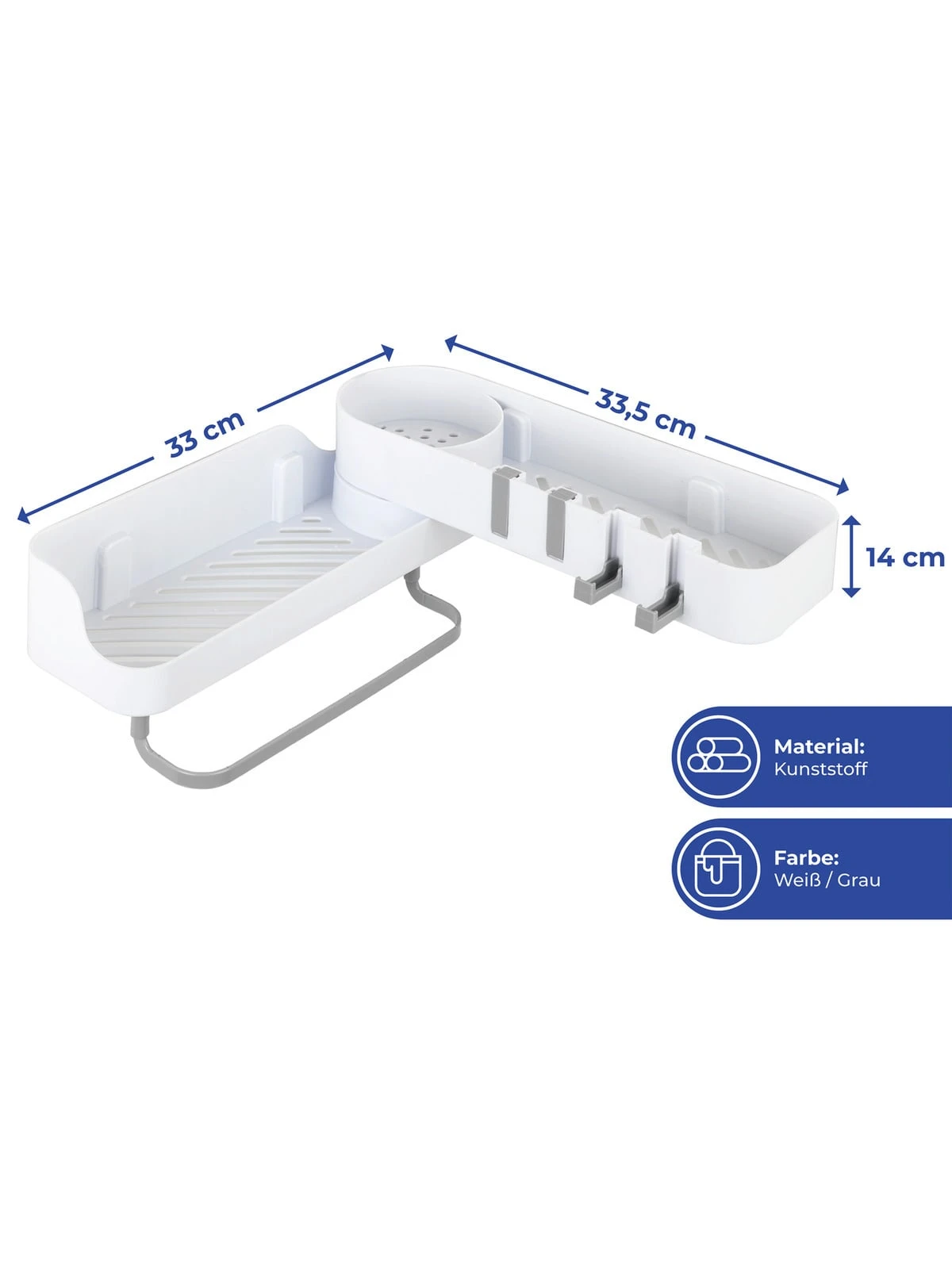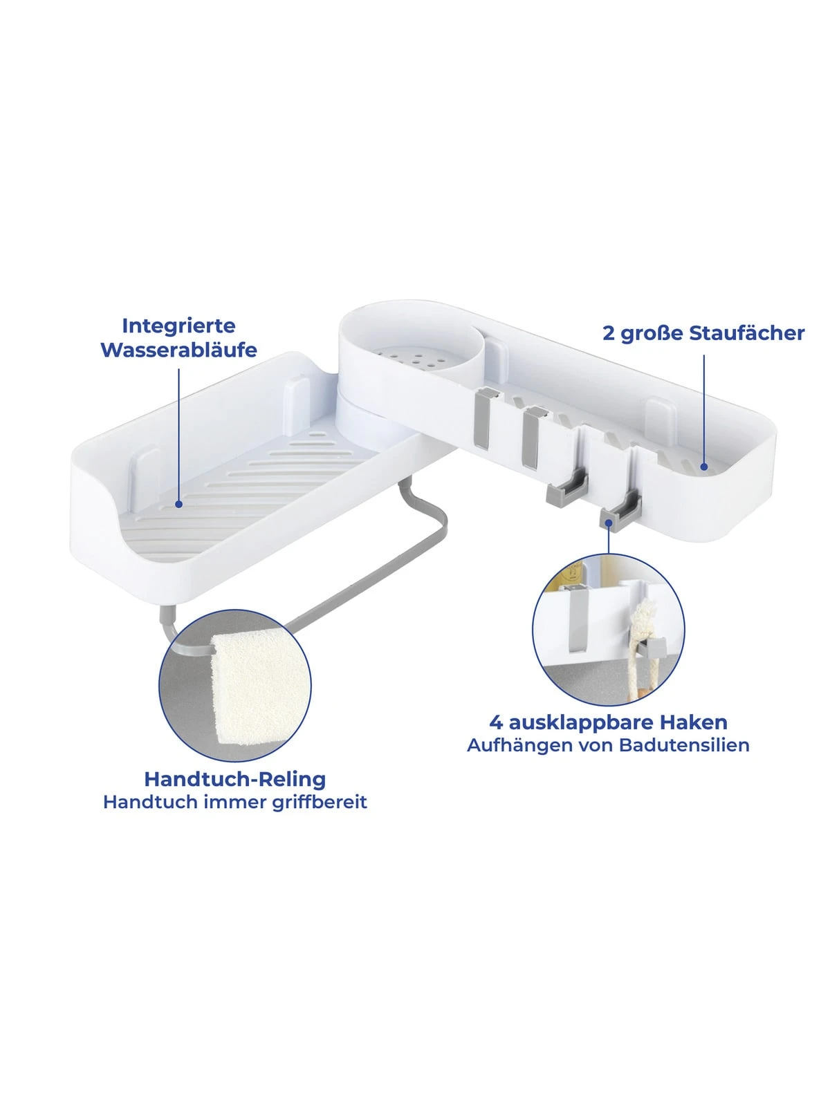 Die 2 großen Staufächer sowie integrierten Wasserabläufe machen den Caddy zum idealen Ordnungshelfer im Bad, zur griffbereiten Aufbewahrung von Dusch- und Badeutensilien.