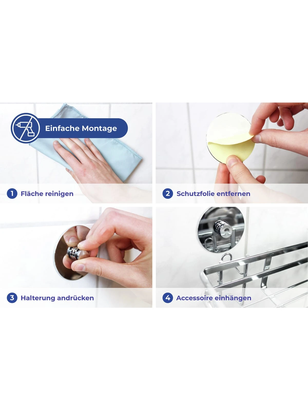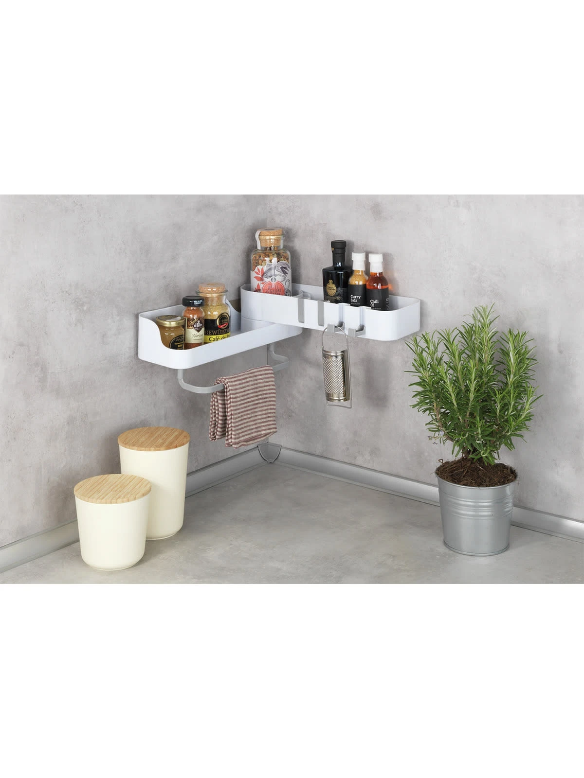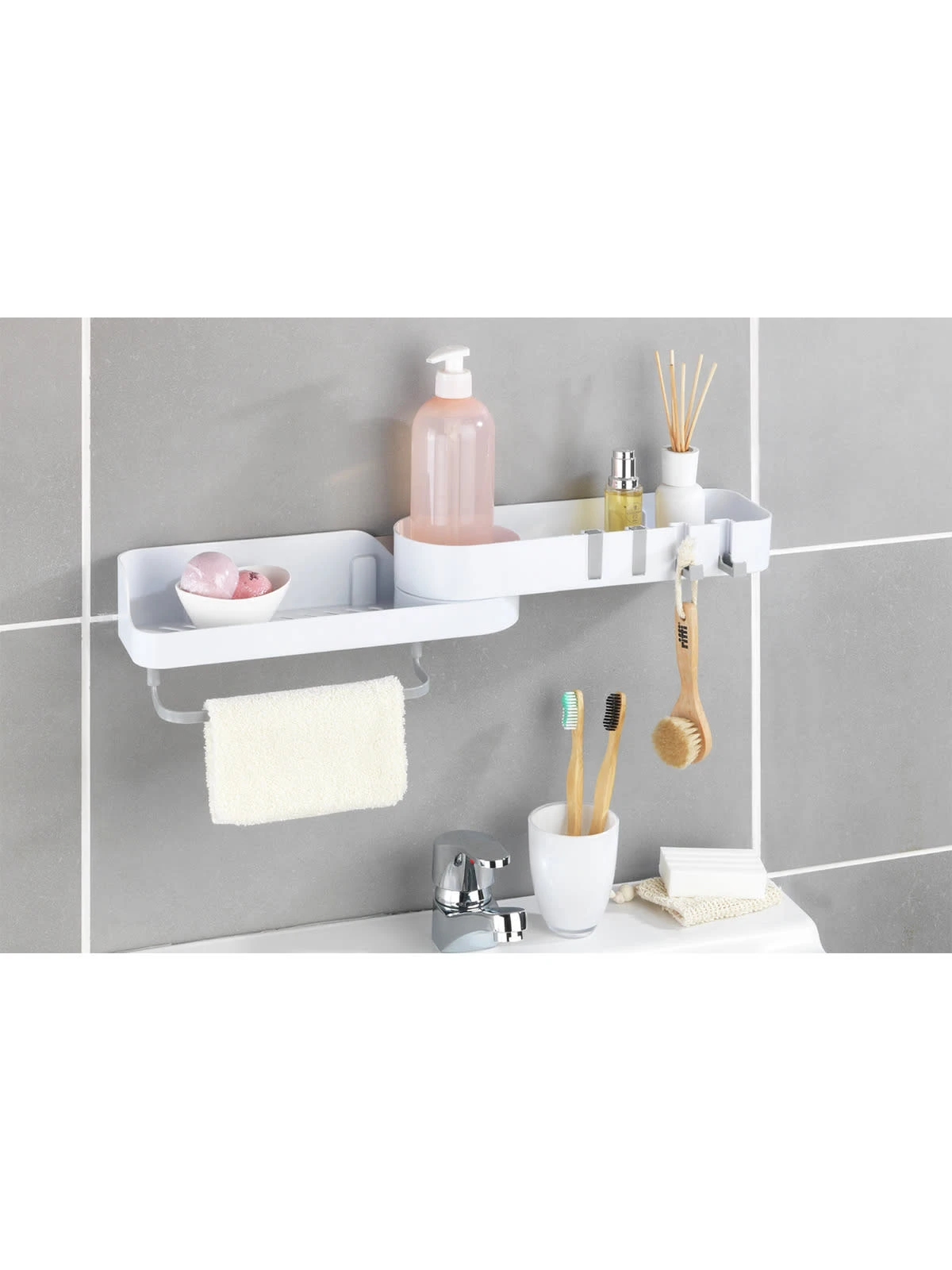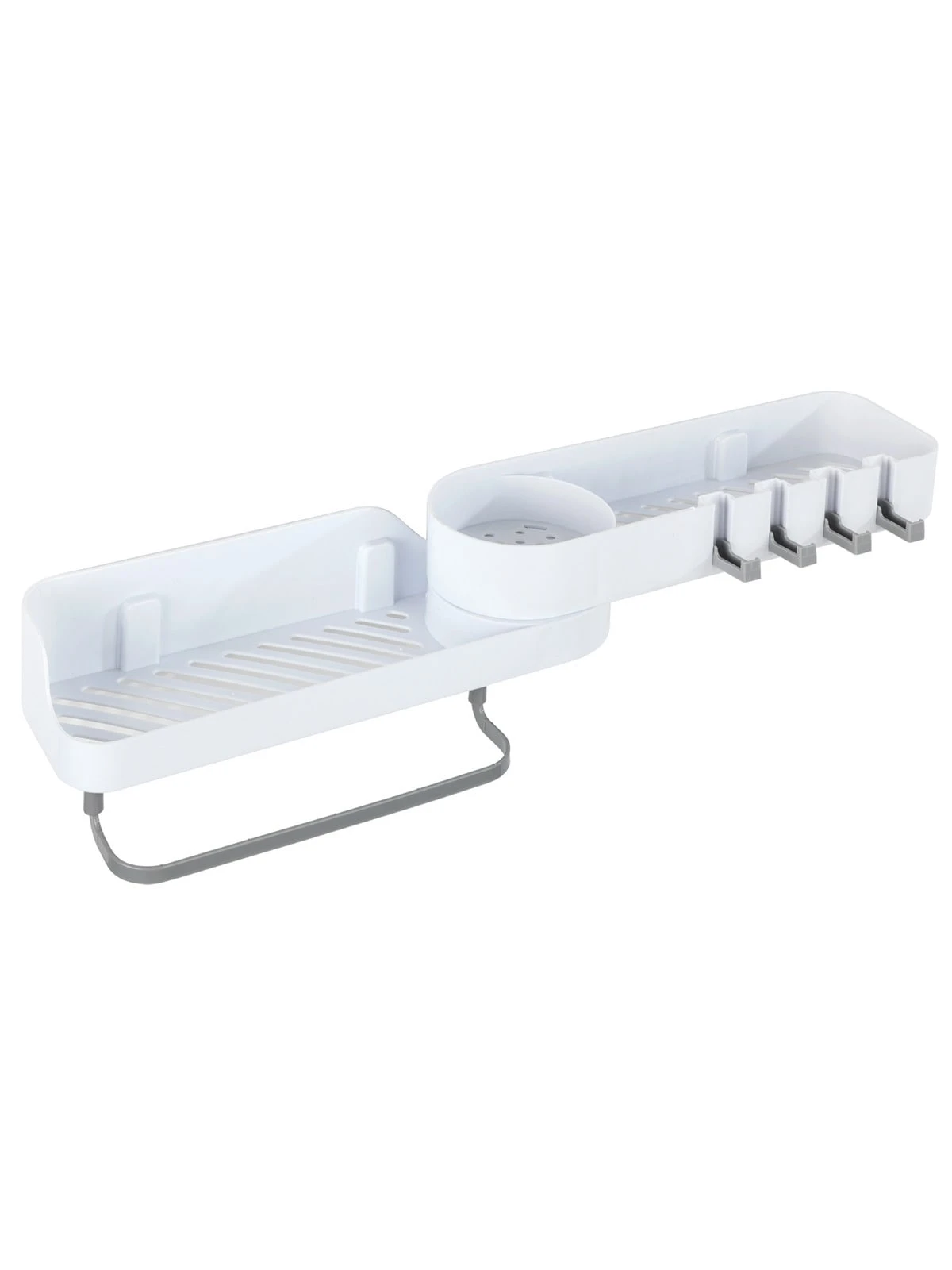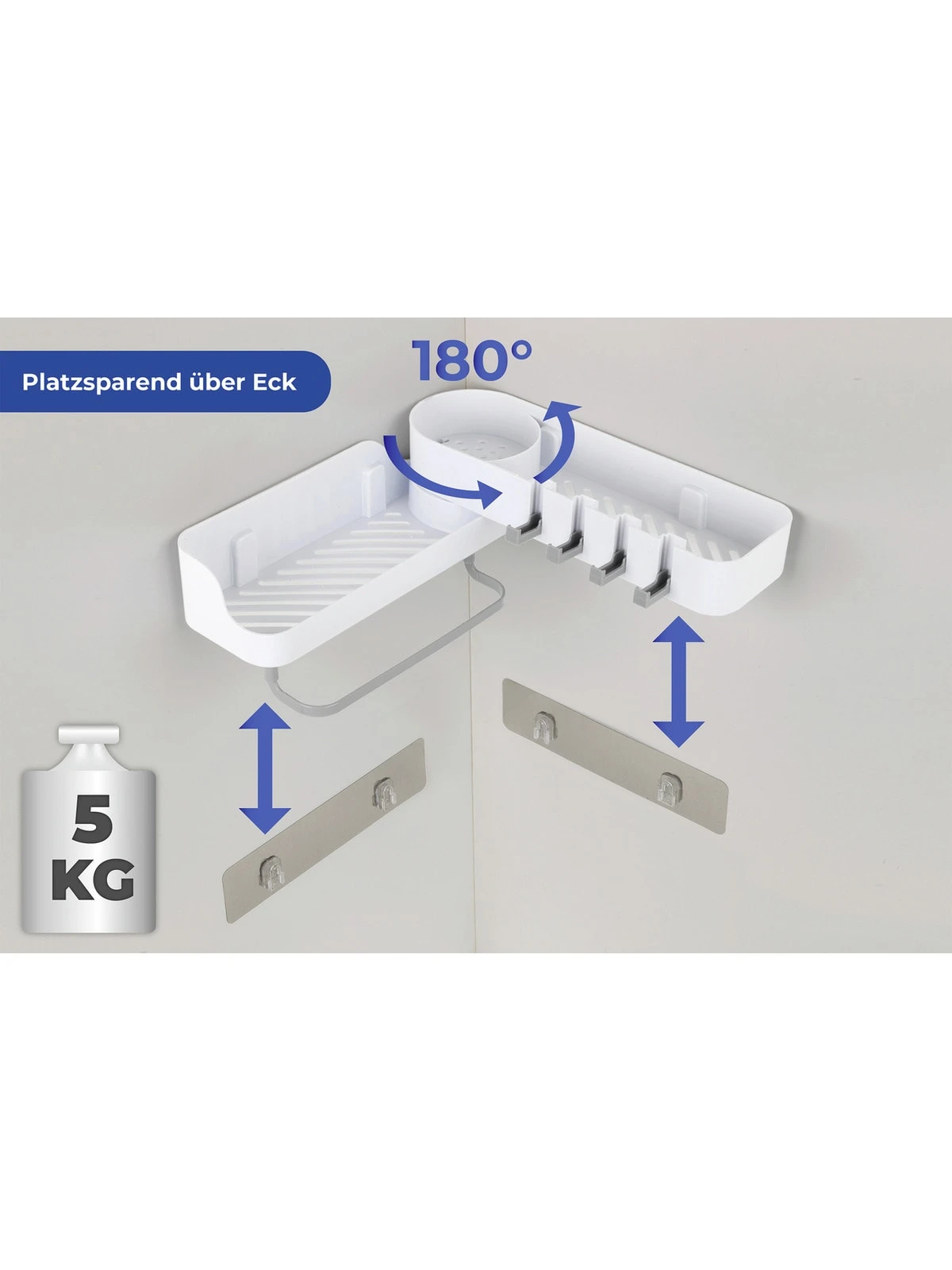 Universell als Ordnungshelfer einsetzbar: Durch sein 180º drehbares Gelenk eignet sich der Caddy perfekt, um Eckbereiche in Bad oder Küche optimal auszunutzen. Auch flach auf der Wand montiert, macht der Caddy jederzeit eine gute Figur.