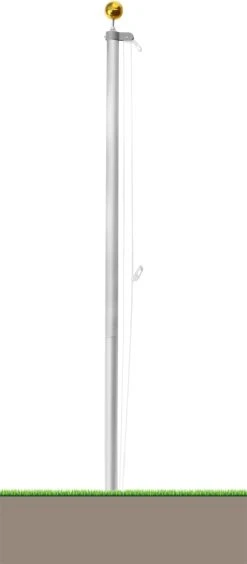 Mit 5 Alu-Steckelementen ist der korrosionsbeständige Fahnenmast (Ø 50 mm) zudem auch höhenvariabel. Dieses System ermöglicht es, den Fahnenmast in den Wintermonaten platzsparend im Keller zu verstauen. Ein attraktives, kugelförmiges Abschlusselement krönt den Mast, per mitgelieferter Bodenhülse wird er sicher im Boden verankert.