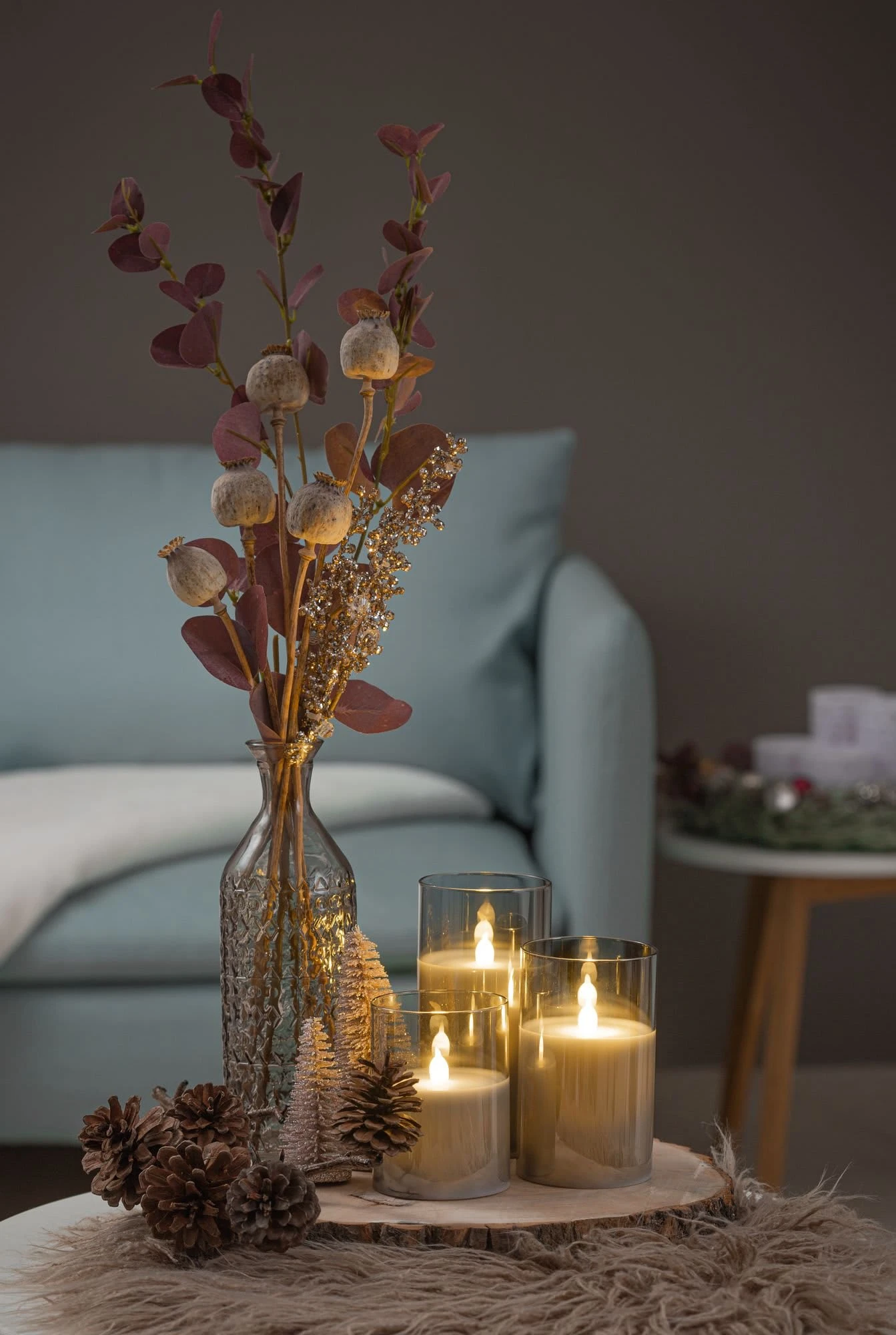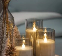 Das leicht spiegelnde Glas verleiht den LED-Kerzen einen edlen Look. In Kombination mit dem leicht flackernden, warmen Licht zaubern die Kerzen eine romantische Atmosphäre. Durch das Flackern der warmweißen LED-Flamme entsteht ein täuschend echter Kerzen-Effekt. Garantiert rußfrei – perfekt für Haushalte mit Kindern oder Tieren. Die LED-Kerzen von Pauleen sind batteriebetrieben (je 2x AA, nicht enthalten). Unter der Kerze befindet sich der An- und Aus-Schalter. LED-Kerzen sind vielfältig einsetzbar: Zuhause als Deko, auch im Regal oder unter Vorhängen – Als Hochzeitsgeschenk oder Geburtstagsgeschenk – Zu Weihnachten auf dem Adventsteller – Im Wohnwagen oder Zelt – Als Deko auf Familienfeiern oder Partys. Pauleen steht für dekorative Licht-Ideen für eine gemütliche Atmosphäre im eigenen Zuhause. Verpackungsinhalt: 3er Set LED-Kerzen, Bedienungshinweise