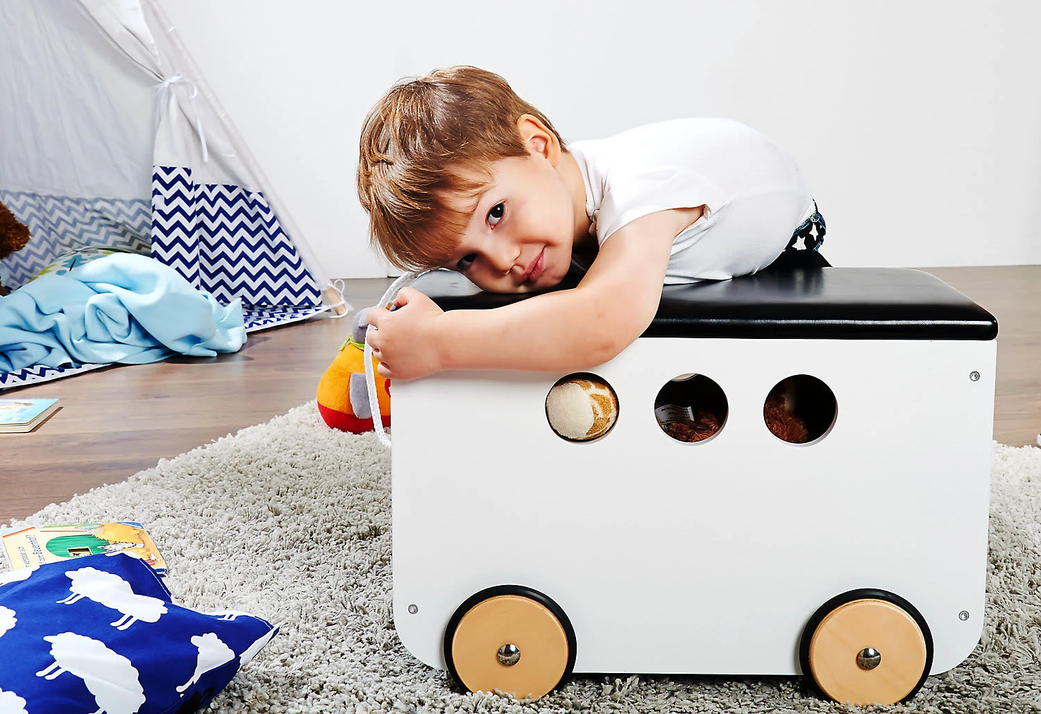 Die Spielzeugkiste “Jim” von Pinolino ist ein echtes Multitalent: So dient sie nicht nur als praktische Aufbewahrungsmöglichkeit für die Lieblingsspielzeuge, sondern kann auch als praktische Sitzgelegenheit oder Wagen benutzt werden. Dank gummierter Rollen lässt sie sich durch die Schnur ganz einfach herumziehen. Sowohl der weiche Kunstlederüberzug des Deckels als auch die Lackierung der Kiste können bei Bedarf im Handumdrehen gereinigt werden, wenn es mal wieder wilder zugeht.