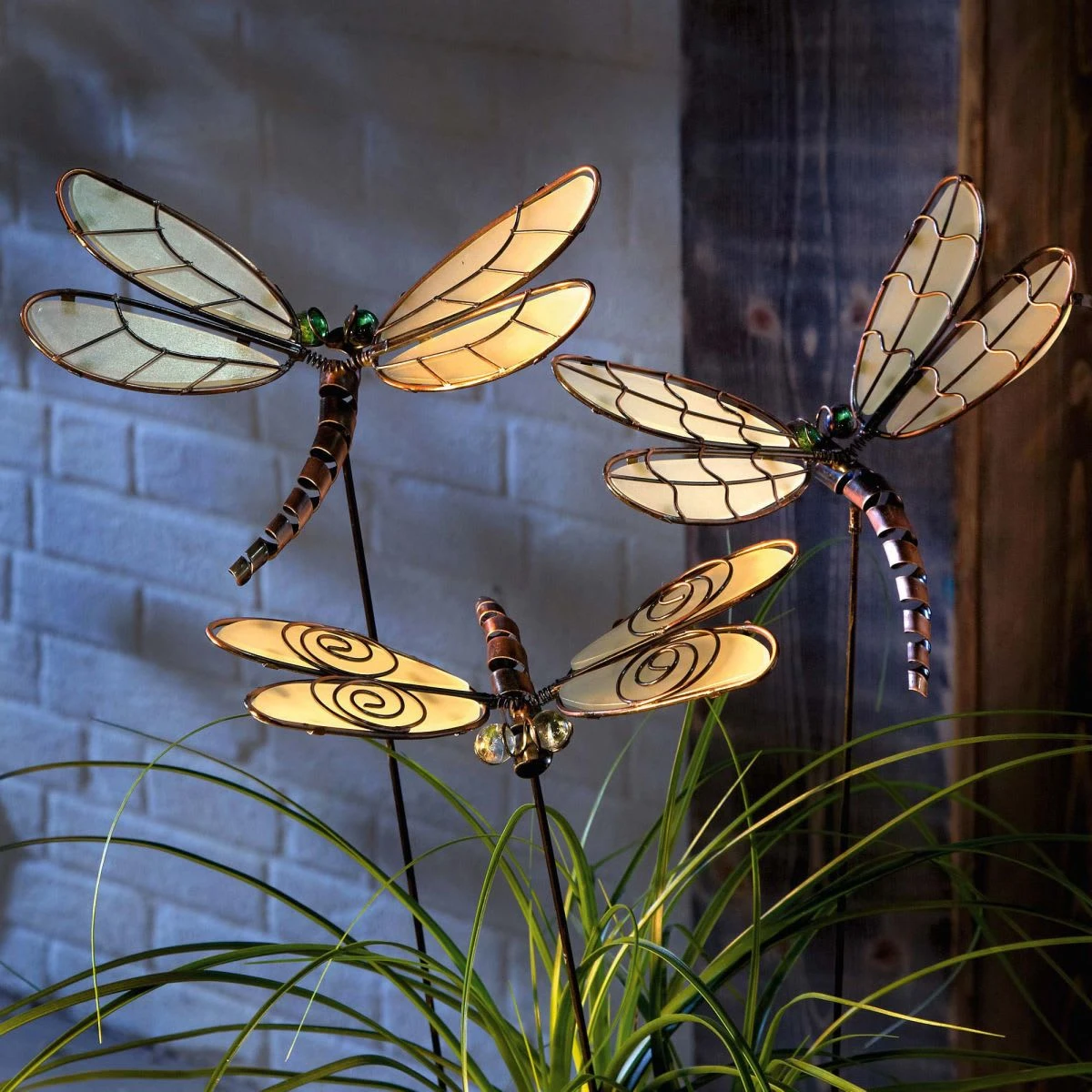 Jede dieser Libellen aus Metall hat ihr eigenes Design und leuchtet wunderschön in der Dunkelheit, nachdem sie sich mit Tageslicht aufgeladen hat.