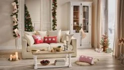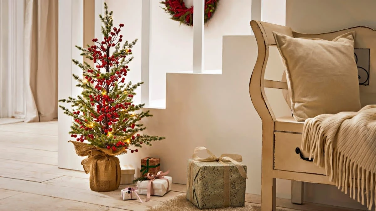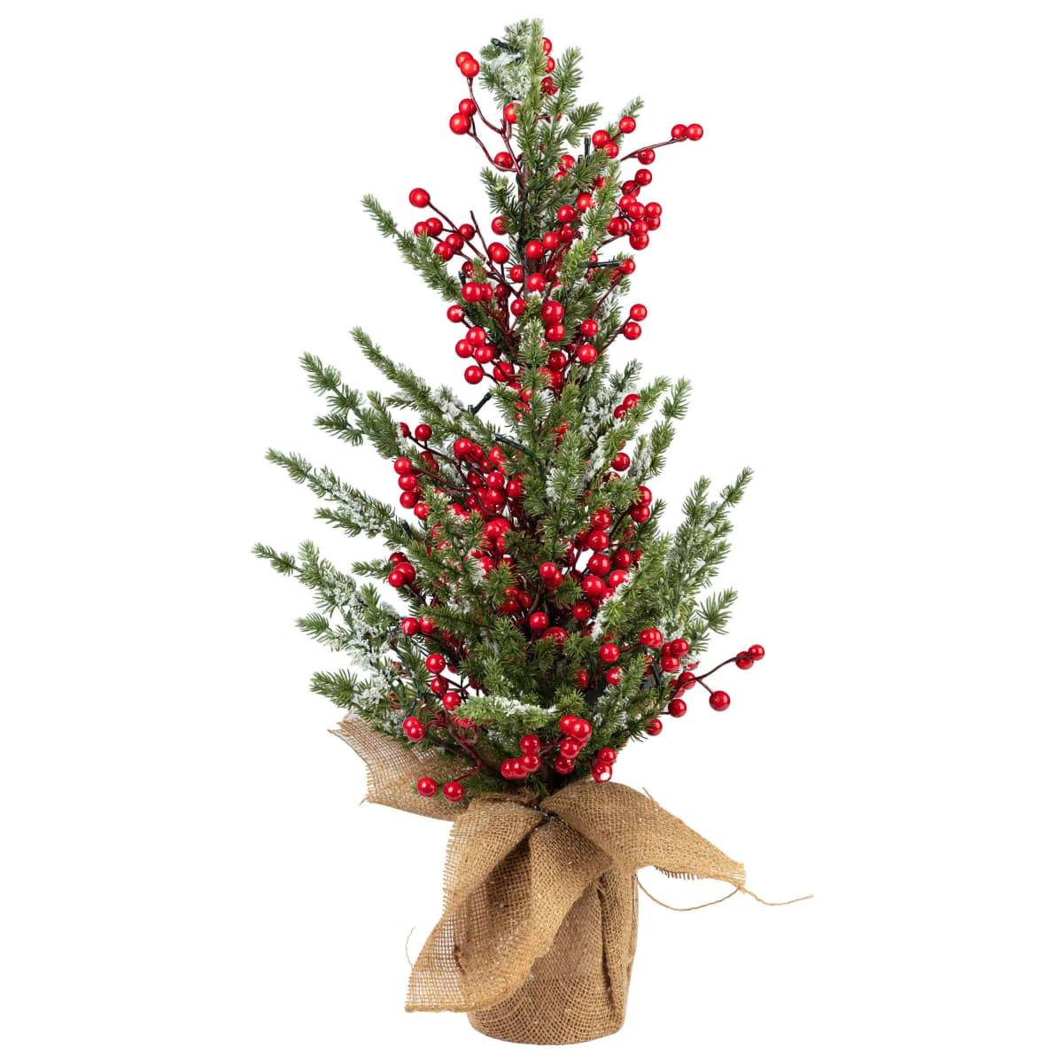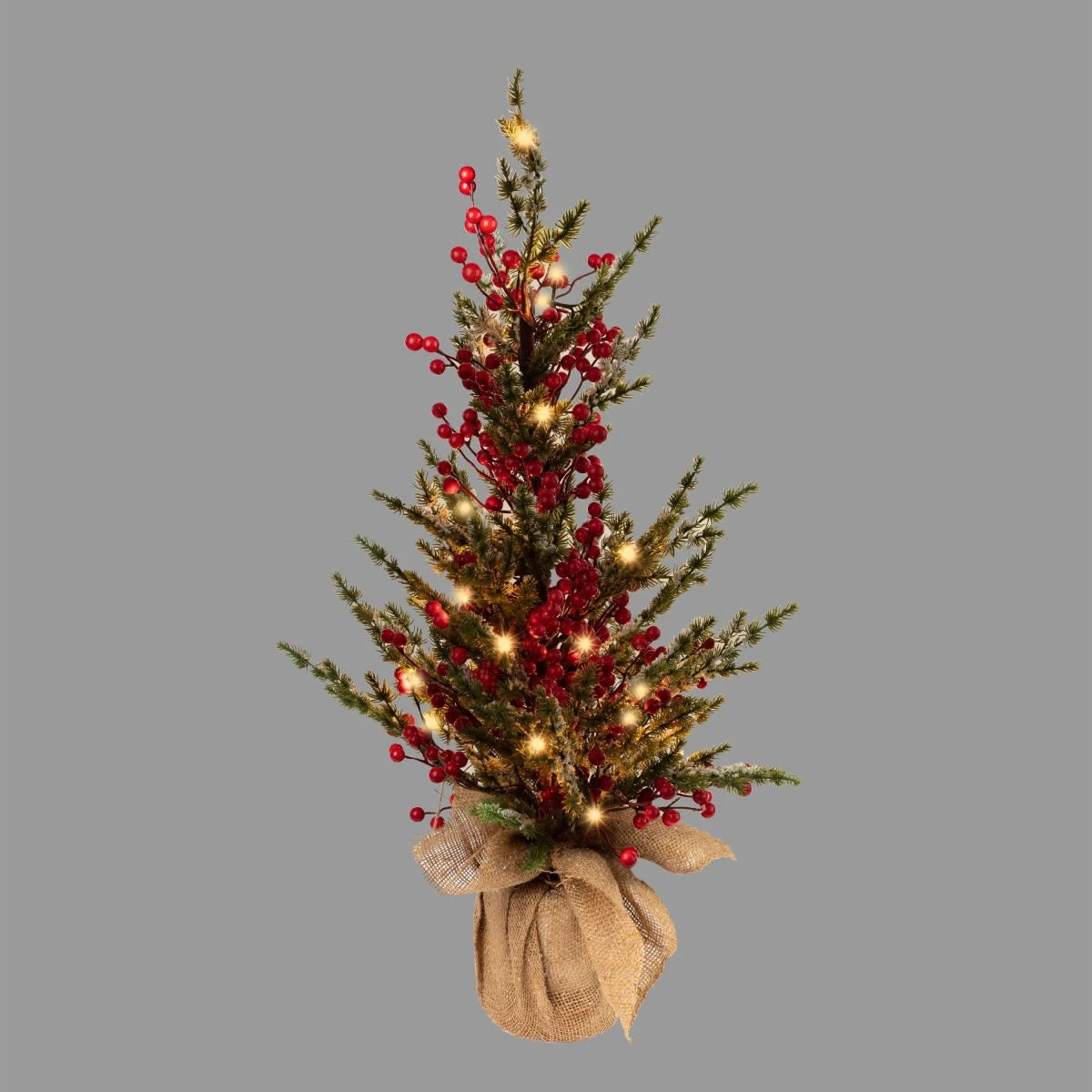 Beleuchtetes Tannenbäumchen mit roten Beeren. Kein Stromanschluss oder Verklängerungskabel nötig – der Weihnachtsbaum ist batteriebetrieben und so ganz flexibel dort aufzustellen, wo gewünscht.