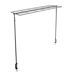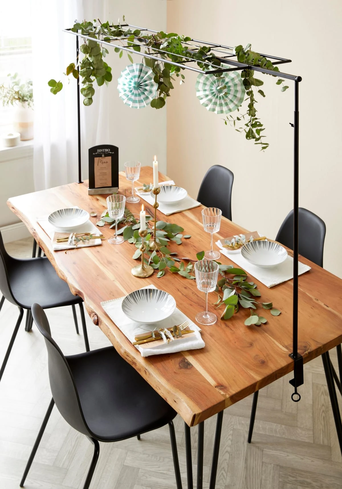 Moderner Tischdekorationshalter, der aus sechs stabilen Metallstangen plus Gitter zum Ineinanderstecken besteht. Die Befestigung kann mittels zwei Schraubzwingen an jedem Tisch befestigt werden. Die obere Stange wird oben aufgelegt und ist bis zu 2,40 m ausziehbar. Nun kann das Gestell beliebig dekoriert werden.
