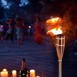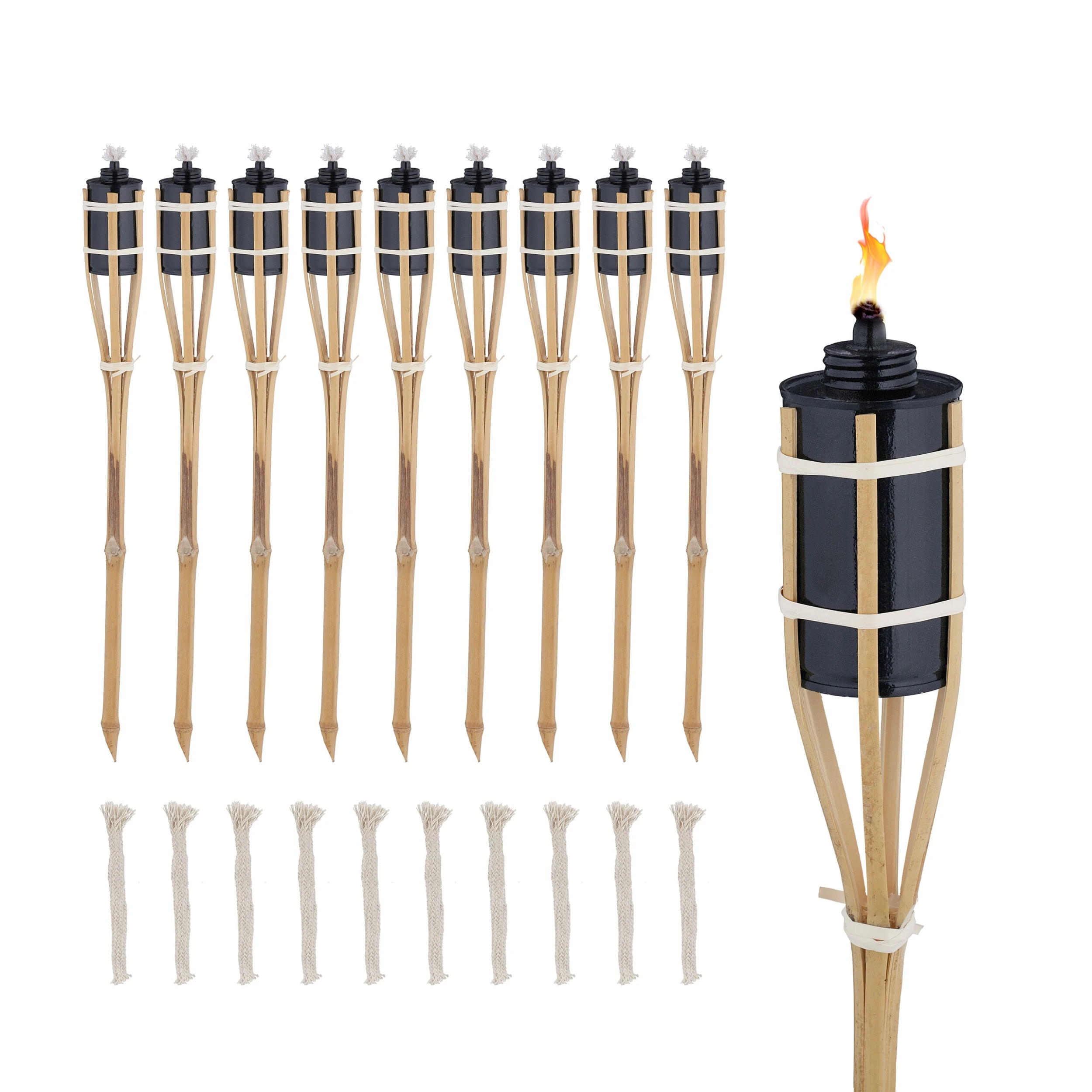 Mit diesen Bambusfackeln im 10er Set bringst Du stimmungsvolle Beleuchtung in Deinen Garten. Platziere die Petroleumfackeln als Deko oder Wegeleuchten bei Hochzeiten, Geburtstagen oder Grillpartys und lasse Dich von der Atmosphäre mitreißen, welche durch die in der Dunkelheit flackernden Flammen erzeugt wird. Mithilfe des angeschrägten Stiels lassen sich die Ölfackeln ganz einfach in den Boden stecken. Anschließend muss nur noch der Öltank befüllt werden, um die Fackeln anzünden zu können.