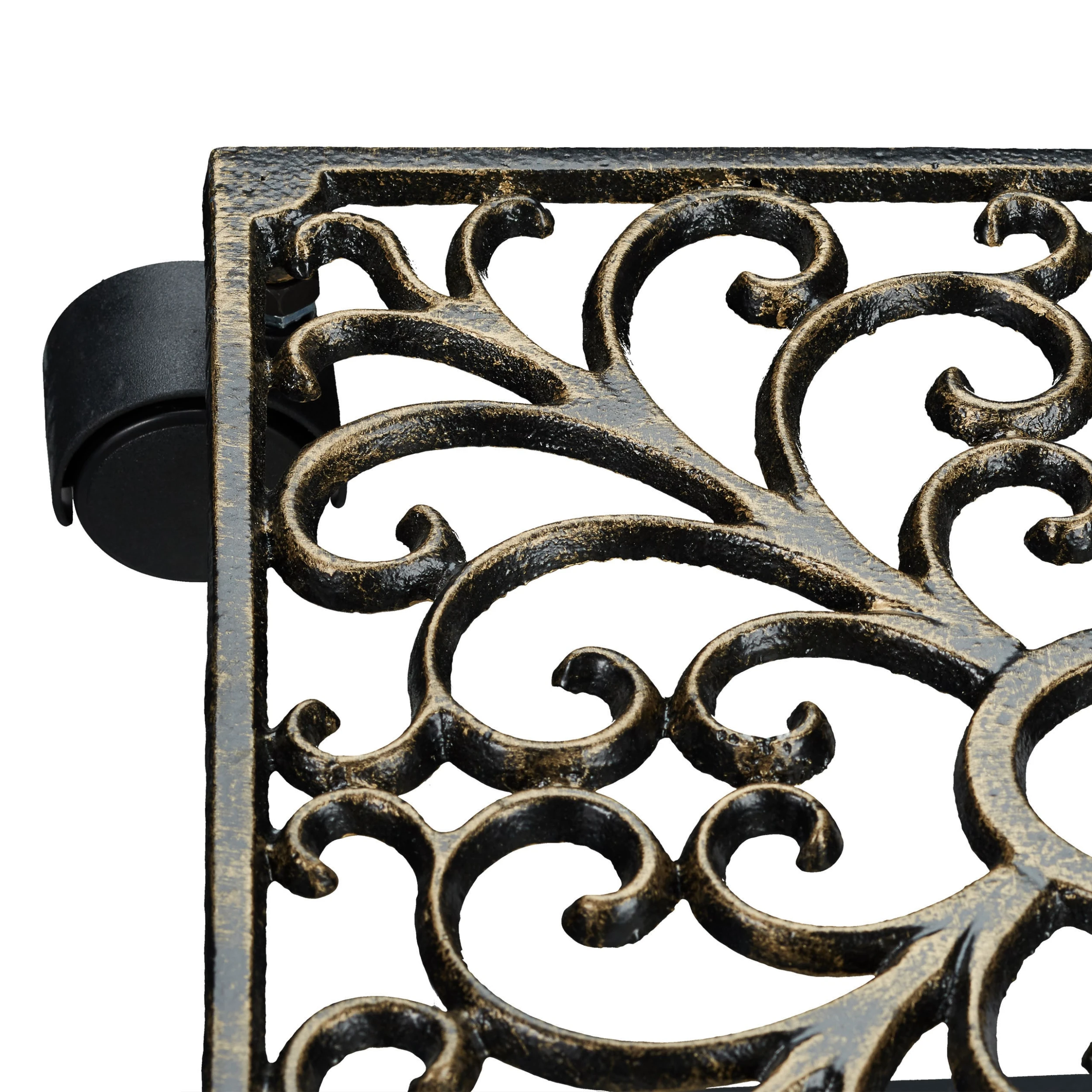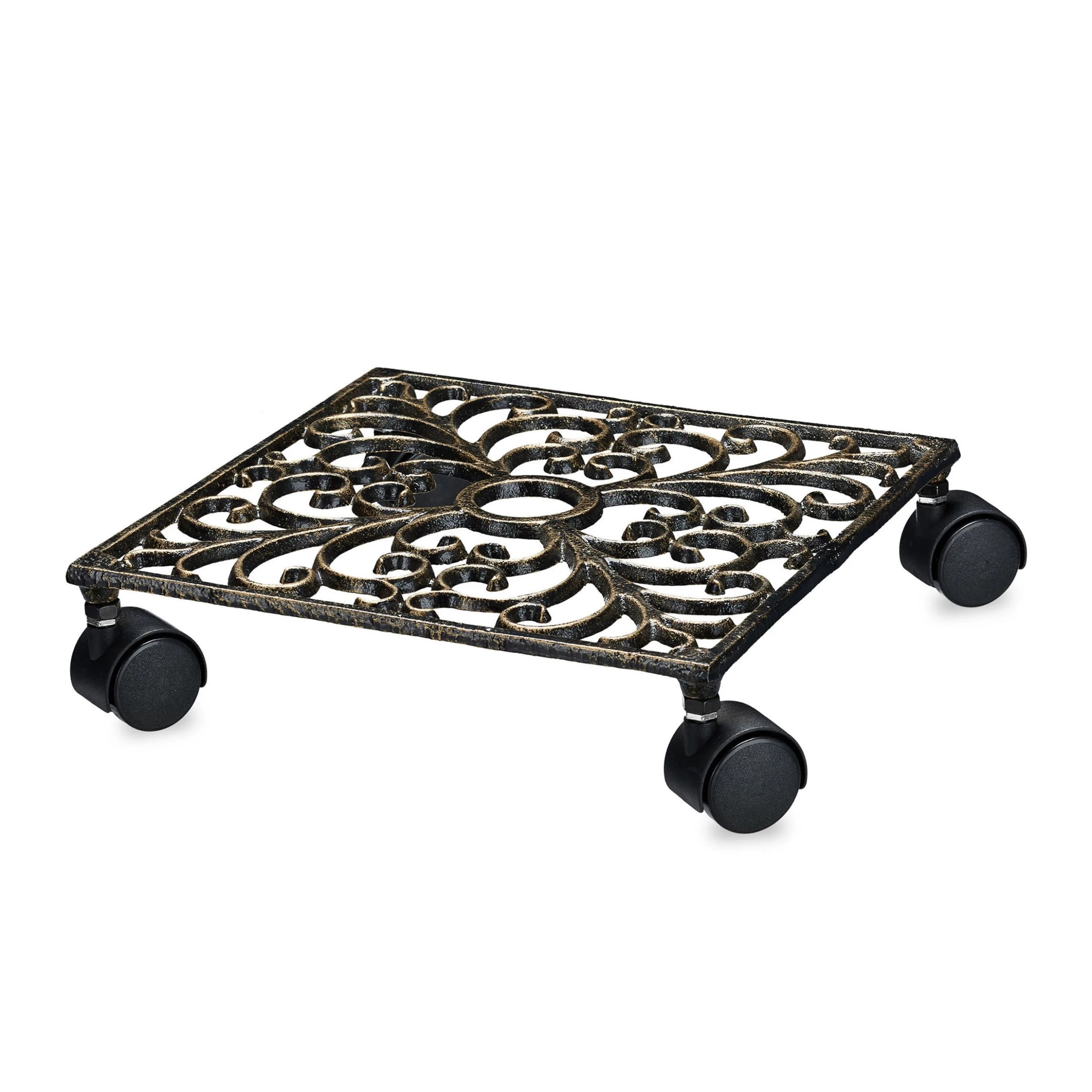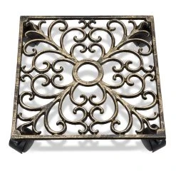 Bewegen Sie Ihre Topfpflanzen bequem mit diesem Pflanzenroller. Der Blumenroller besteht aus wetterfestem Gusseisen und verfügt über 4 Rollen aus Kunststoff. Dadurch steht er stabil und lässt sich leicht bewegen. Der Pflanzenuntersetzer ist mit dekorativen Ornamenten verziert und passt perfekt zum Jugendstil und Landhausstil.