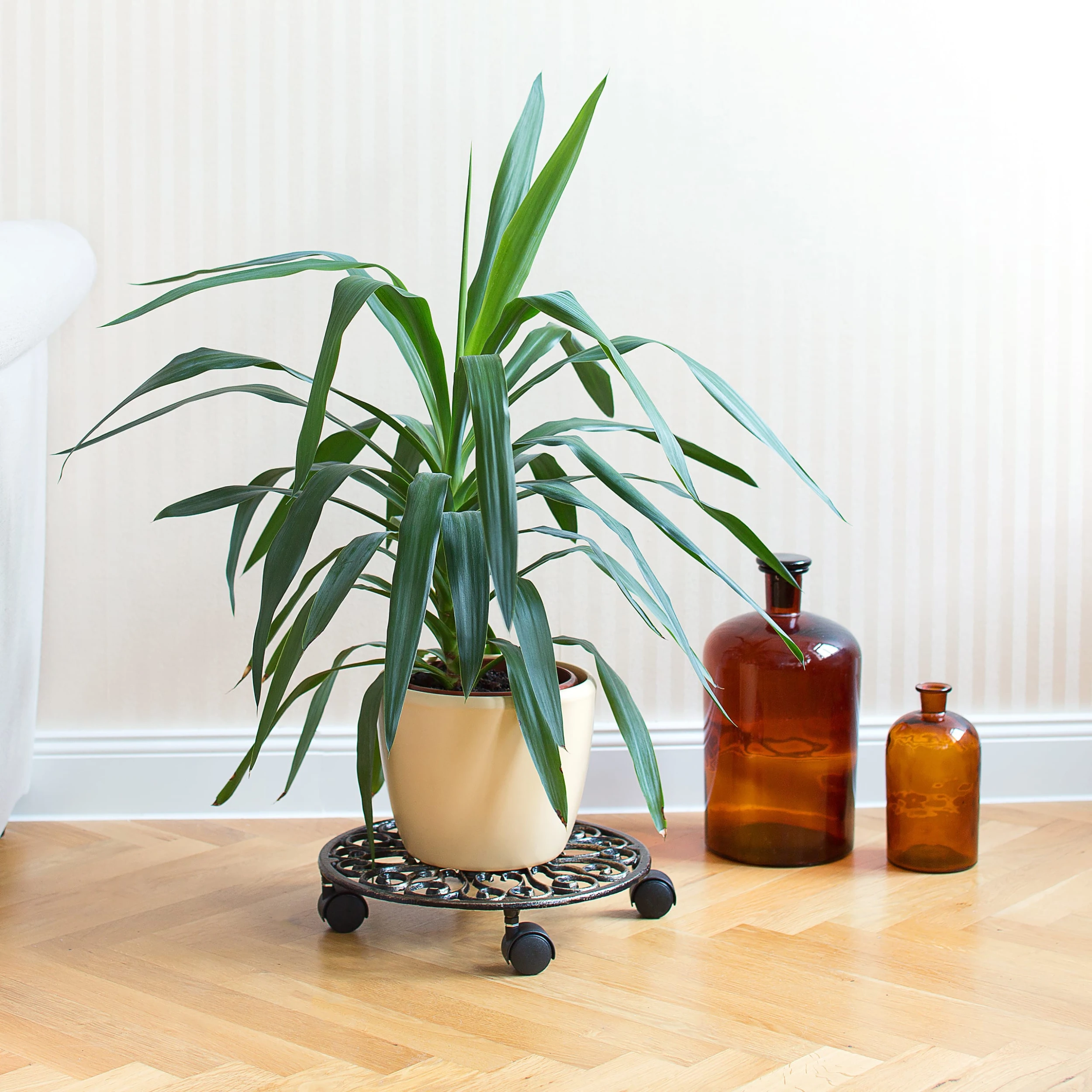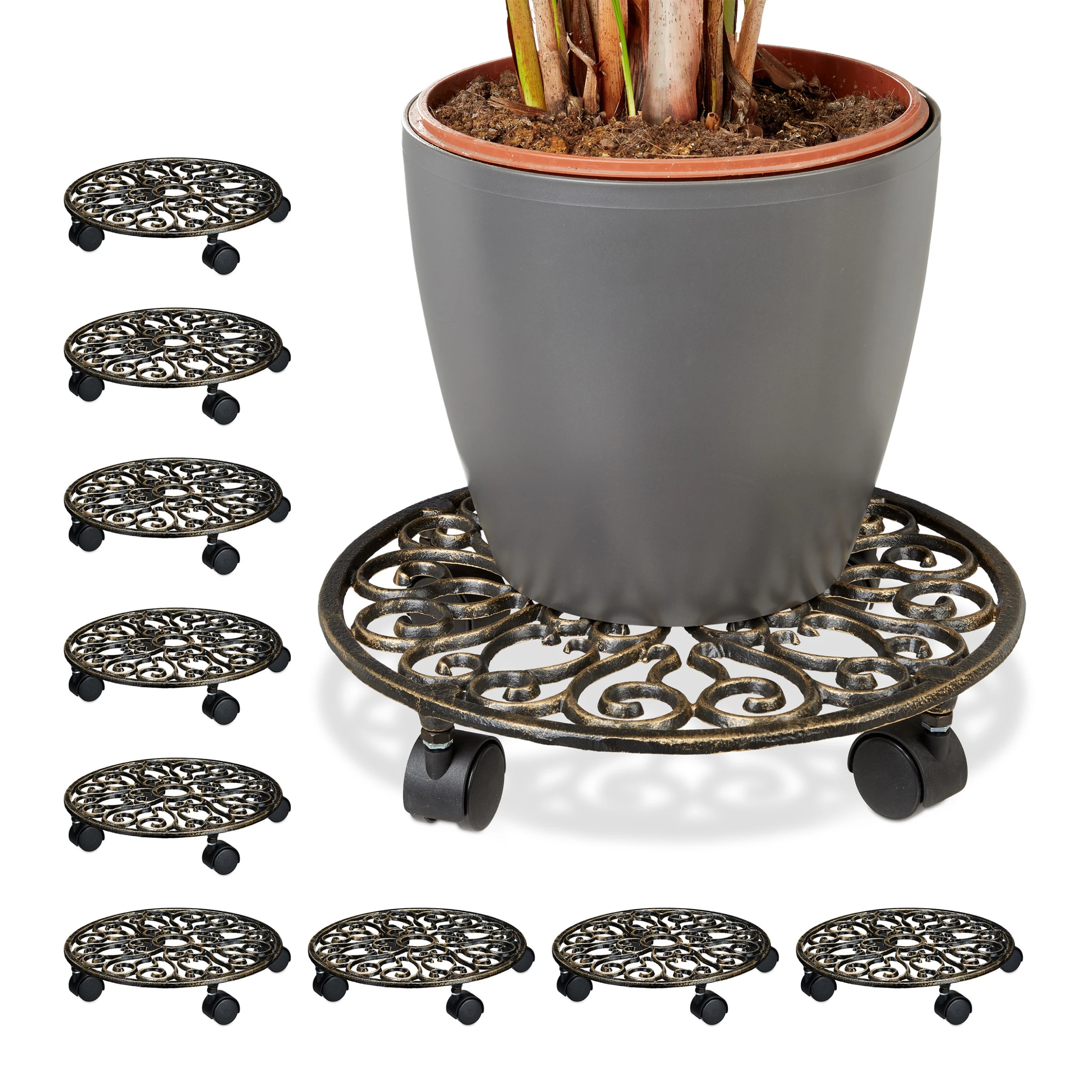 Bewegen Sie Ihre Topfpflanzen bequem mit diesem Pflanzenroller. Der Blumenroller besteht aus wetterfestem Gusseisen und verfügt über 4 Rollen aus Kunststoff. Dadurch steht er stabil und lässt sich leicht bewegen. Der Pflanzenuntersetzer ist mit dekorativen Ornamenten verziert und passt perfekt zum Jugendstil und Landhausstil.