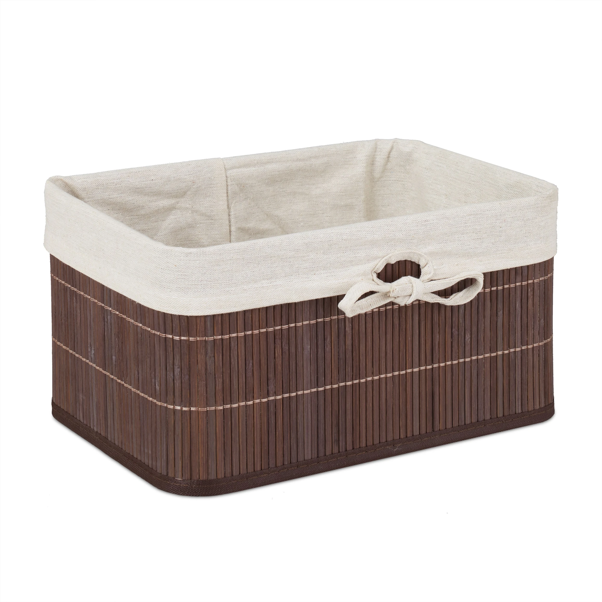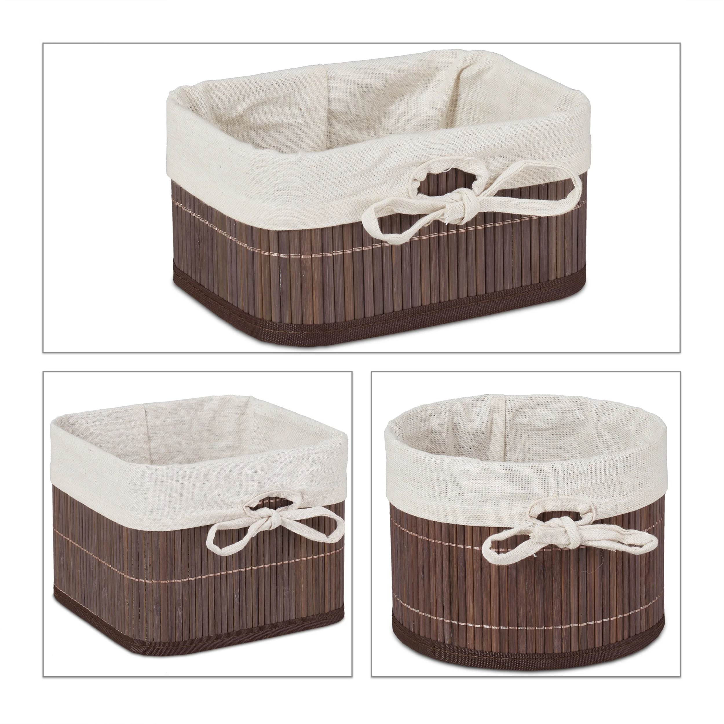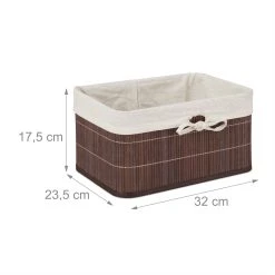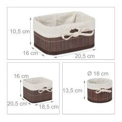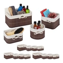 Die 16 Aufbewahrungskörbe aus Bambus bieten genug Platz für Deine Kleinigkeiten. Egal ob im Bad, in der Küche oder im Wohnzimmer – Die Boxen machen überall eine gute Figur. Die runden und eckigen Formen passen in jeden Schrank und in jedes Regal. Die natürliche Farbe der Kisten sind für jede Einrichtung geeignet – abgerundet werden sie durch den Stoff-Bezug in Leinen-Optik. Ihre Robustheit erhalten die Bambusboxen durch die Unterseite, welche aus beständigen MDF-Platten ist.