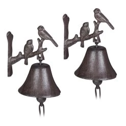 Die Türglocke aus Gusseisen mit den hübschen Vögeln verschönert Eingangsbereiche, Terrasse und Garten. Neben Tür und Tor an der Wand befestigt, wirkt die Glocke nicht nur einladend, sie kann mit ihrem hellen und lauten Klang auch dazu dienen, Freunde und Familie zusammenzutrommeln. In antiker Optik versprüht die Eisenglocke Vintage Charme und dekoriert im nostalgischen Landhausstil Ihren Außenbereich. Dank der drei vorgebohrten Löcher kann die wetterfeste Metallglocke leicht angebracht werden.