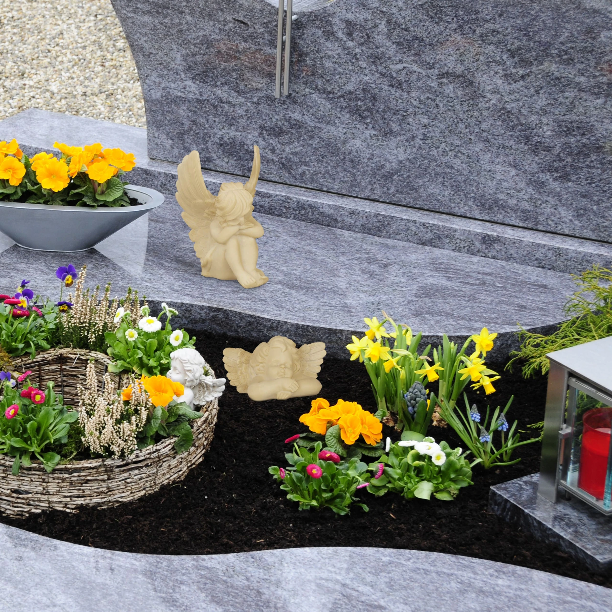 Platzieren Sie die Schutzengel als Schmuck auf dem Grab des Verstorbenen. Die Engel stehen dabei für eine Verbindung zwischen den Menschen auf der Erde und dem Himmel. Dadurch können Sie über die Beerdigung hinaus Liebe und Verbundenheit mit dem geliebten Menschen ausdrücken. Durch das wetter- und frostfeste Material werden die Engel zu langlebigen Begleitern auf dem Friedhof und können das ganze Jahr über draußen stehen bleiben.