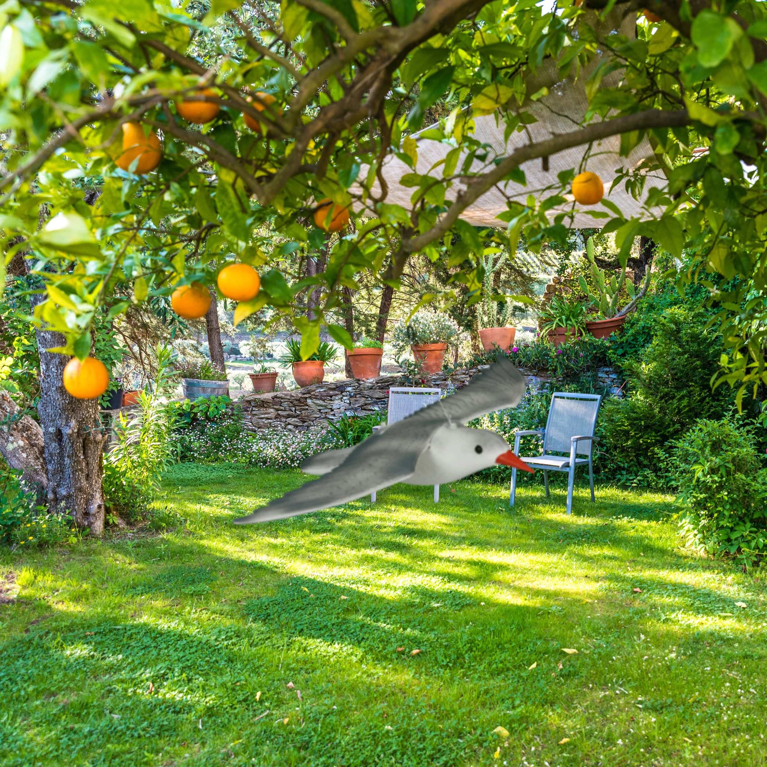 Ihr Garten gefällt nicht nur Ihnen, sondern auch so manchem gefiederten Zeitgenossen? Ob Spatzen, Amseln oder Tauben: Viele Vögel lassen sich leckere Früchte schmecken und beschmutzen Fensterbretter, Dächer und Wege. Mit dieser Figur einer fliegenden Möwe vertreiben Sie die unliebsamen Gäste. Der Vogelschreck lässt sich dank der Schnur leicht aufhängen. Die detailgenau gestalteten Flügel stecken Sie einfach mit dem Rumpf zusammen – fertig! Die dekorative Vogelattrappe hält Wind und Wetter stand.