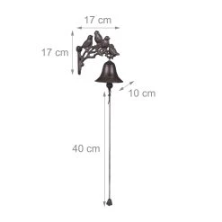 Die Türglocke aus Gusseisen mit den hübschen Vögeln verschönert Eingangsbereiche, Terrasse und Garten. Neben Tür und Tor an der Wand befestigt, wirkt die Glocke nicht nur einladend, sie kann mit ihrem hellen und lauten Klang auch dazu dienen, Freunde und Familie zusammenzutrommeln. In antiker Optik versprüht die Eisenglocke Vintage Charme und dekoriert im nostalgischen Landhausstil Ihren Außenbereich. Dank der drei vorgebohrten Löcher kann die wetterfeste Metallglocke leicht angebracht werden.