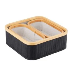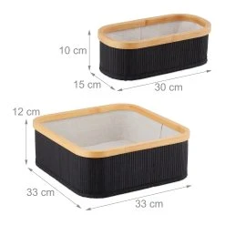 Mit diesem 3er Set Utensilienkörbe holst Du Dir praktische und zugleich dekorative Ordnungshelfer nach Hause. Ob als Badezimmeraufbewahrungskörbe für Kosmetik und Co, als Regalkörbe in Wohnzimmer und Flur oder kleine Aufbewahrungskörbchen auf der Wickelkommode – die Körbe in 2 unterschiedlichen Größen passen in jeden Raum und sorgen dort für mehr Übersicht. Bei Nichtgebrauch können die schwarzen Bambuskörbe platzsparend ineinander gestapelt werden.